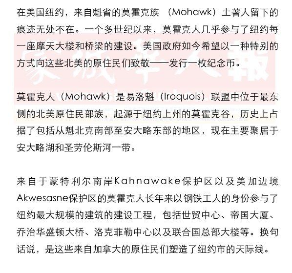 来自Kahnawake保护区的莫霍克人第一次参与到建筑工程中还要追溯到1886年,当时加拿大自治区(Dominion)大桥公司开始在圣劳伦斯河上建设一条跨河大桥。公司当时以雇佣莫霍克工人为条件,换取了在其领地上开设工地的权利。 56岁的Michael Stalk Sr在上世纪80年代历时7年在纽约的多个工地中工作过。他表示,担任建筑工人在长时间以来成为了莫霍克人的一种传统。很多原住民在保护区附近找不到合适的工作,因此不得不南下前往美国寻找机遇。他表示,能够跟随着自己父母以及祖父母一辈人的足迹南下工作是一种荣耀。 据他称,有些时候,纽约工地上90%的工人都是他的老乡——来自蒙特利尔南岸的Kahnawake原住民保护区。 George “Pidgie” Norton表示,莫霍克人南下参与建筑工作的最大的热潮发生在60年代。当时保护区里大量的男人都前往纽约寻找工作,以至于纽约的很多工地里都在说莫霍克语。George Norton一直干到68岁才退休。他作为建筑工人干了42年,曾经在旧世贸中心6号塔楼的建设工程中出过一份力。他回说,当时,纽约的大小工地都在雇佣莫霍克工人,因为传说这些原住民从来不会头晕,也不会恐高。 72岁的Sam Kirby回忆说,当时如果有当地工人拒绝爬到过高的高度工作,工头就会说:去找点莫霍克人来! Sam Kirby曾经在60年代参与了连接纽约与布鲁克林的韦拉札诺海峡大桥 (Verrazano-Narrows Bridge) 的建设。他当时才刚刚18岁,每天工作时都会在自己的安全帽上插一根羽毛以表明自己的身份。 著名的纽约作家Gay Talese在他的作品《Fame and Obscurity》中着重描写了莫霍克工人们卓越不凡的勇气。 勇敢的莫霍克人 ◆ 在整个上个世纪50年代,有大约800名莫霍克工人活跃在纽约的各大工地上。 ◆ 上世纪50年代在纽约布鲁克林的莫霍克人数众多,以至于布鲁克林的一个社区被命名为“小Kahnawake”。 ◆ 如今仍然有大约200名莫霍克人在纽约担任建筑工人,占据纽约建筑工人总数的10%。 ◆ 有些莫霍克建筑工人可以拿到10万加元的年薪。有些莫霍克工人已经是家族里第6代从事这一行业的人了。 ◆ 这些活跃在纽约的莫霍克工人中有一大部分在每个周末都会回到加拿大的保护区探望他们的亲人。 ◆ 已经退休的George Norton表示,与老一辈相比,现在很多年轻的莫霍克人已经不想干这一行了。蒙特利尔到纽约的往返费用以及纽约周边的房租已经变得越来越贵。与此相比,年轻的莫霍克人更希望去学校进修,这样他们就会比老一辈拥有更多的选择。 ◆ 莫霍克人并不止在纽约这一个美国城市从事建筑工作。他们的足迹遍布美国各地,包括旧金山的金门大桥以及芝加哥的Sears大厦等大型工程都有莫霍克人的参与。 ◆ 在2001年9月,在世贸中心的双子大厦遭恐怖袭击倒塌后,那些曾经参与建设这一伟大建筑的莫霍克人的子孙们来到纽约,并参与了这座曾经由他们的父辈建设的大厦的拆除工作。 ◆ 不少莫霍克人此时此刻仍在北美各地的建筑工地中忙碌着。 |