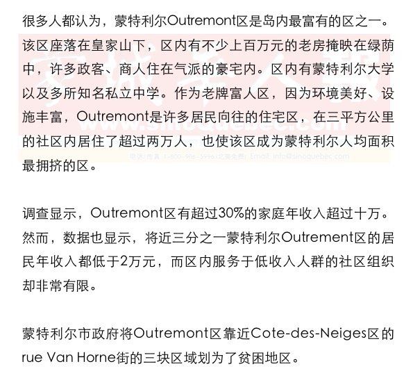 Outrement区区长Marie Cinq-Mars称,这个结果她一点都不感到惊讶。因为在大选时她曾经造访过许多选民的住宅,看到低收入家庭在Outremont区是事实存在的。 慈善组织Outremont之家(Outremont en famille)的创始人之一Claire-Isabelle Mauffette也持同样的看法。她说,对于所有当地家庭来说这并不是令人愉快的信息。有些家庭面临着财务困难,但仍然选择住在这里,因为这里对于孩子们来说是一个非常好的社区。 Anna Linnikoff已经在Outremont区居住了3年,她和儿子住在一套月租金865元的3 半公寓内,以时薪15元的收入支撑着自己房屋的租金。她知道租金很贵,但是并不打算离开这里。她强调说,自己非常喜欢这个区,也喜欢儿子上学的学校,对他在那里接受的教育感到非常满意。她现在寄希望于一项面向家庭的住宅合作项目,目前区行政委员会正在进行研究。她解释说,如果这个Suroît合作项目得以实现,她就可以接受一项培训并且得到一个房间。而那个时候,她的儿子正好需要一个单独的房间。 居民Noel Bertrand为人们将Outrement列为富人区的想法感到遗憾。他的家庭每个月需要支付1500元房屋租金,但他不愿意因为经济的原因离开这里,因为从15年之前他就开始参与这里的社会生活了。 Outrement区可以为中低收入家庭提供经济和社会支持的组织数量很少。居民们不得不跨越区域界线去获取更大范围的资源。 慈善组织Centraide的补助金及社会分析主任Lyne Harris强调指出,同Outremont区交界Cote-des-Neiges区和Plateau区在为Outrement的居民们服务,但是Centraide并不资助当地的组织。 根据蒙特利尔市政府的统计,Outrement区此类服务组织只有一个青年中心、两个面向老年人的社区团体以及Outrement之家。创立于2009年的Outrement之家,还特别同集体食堂进行合作以便让贫困家庭获得廉价健康餐。区长Cinq-Mars强调,社区还有近500名志愿者随时准备在需要的时候提供帮助。 5月13日,Outremont之家将组织一场论坛,来讨论当地家庭的需求。届时,区议员也都将出席。论坛邀请居民踊跃参与这项活动,前来交流并且提出建议。 Outremont区相关数据 近半数Outremont居民(47%)为租户,平均月租金1120元。 根据经济学家的说法,当一个家庭支出收入的30%以上用于居住,那么其财务状况将变得脆弱。而41%的Outremont租户都超过了这个界限。 生活在Outremont的5870个家庭当中,18%为单亲家庭。区内生活在政府补贴住房中的家庭所占比例为1.4%。 |