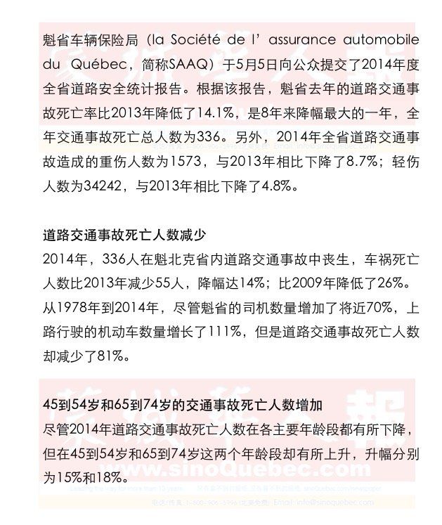 酒后驾驶是事故主要因之一 SAAQ以及其他相关部门对酒后驾驶危害的宣传不遗余力,但酒后驾驶仍旧是造成魁省道路交通事故人员死亡的首要因之一。 2013年,在185名死于交通事故的汽车司机中,有将近三分之一(31.4%)的人的血液酒精含量超过每100毫升血液中80毫克(魁北克省所允许的法定上限)。即便如此,酒后驾驶的比率还是比2012年下降了大约5%。 15到24岁的年轻司机自2009年以来表现最佳 15到24岁的年轻司机常常是人们指责的对象,但2014年却是这些年轻司机自2009年以来表现最佳的一年。这也许是因为政府的交通安全宣传活动最终取得了成果?在去年死于交通事故的336人中,66人处于15到24岁这个年龄段,占交通事故死亡总人数的19%,比2013年的79人下降了16.5%,比2009年至2013年这段时期下降了37.5%。25到34岁这个年龄段的司机在2014年的交通事故死亡人数也比2013年有所减少,由58人降为47人。18到24岁的司机在2014年取得了显著进步,该年龄段司机的交通事故死亡人数由2009年的122人减少为66人,降幅达46%。 蒙特利尔市和魁北克城的交通事故死亡人数减少 在蒙特利尔市,2014年死于道路交通事故的有32人,比2013年减少1人。 和蒙特利尔南岸Montérégie地区一样,魁北克省会地区的道路交通事故死亡人数也大大减少,2014年整个省会地区死于道路交通事故的有22人,比2013年的40人减少了45%。 Montérégie地区的交通事故死亡人数全省第一 魁北克全省有17个地区,其中半数以上,也就是9个地区在2014年的交通事故死亡人数都有所减少。就全省范围来看,Montérégie地区在去年的交通事故死亡人数下降幅度是最大的,由2013年的83人降为56人,降幅高达32.5%。尽管下降幅度很大,但蒙特利尔南岸Montérégie地区的交通事故死亡人数还是在全省高居第一;紧跟其后的是Laurentides地区,该地区2014年交通事故死亡人数为32人。 |