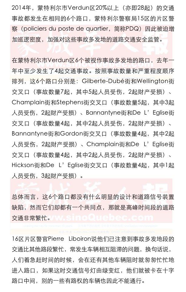 Verdun区2014年导致财产受损的交通事故发生率比2013年增多了11个百分点,事故数量由104起上升为126起。但导致人员受伤的交通事故发生率在同期却下降了27%,无人员死亡事故发生。 Verdun区现已成立一个由区议员和SPVM代表组成的交通及公共安全工作委员会,对Verdun区的现实情况进行研究分析,以确定是否有必要拟定一个安全干预计划。 Gilberte-Dubé街和Wellington街交叉口—— 2014年,在Gilberte-Dubé街和Wellington街交叉口处共发生7起交通事故,其中5起人员受伤。这个路口看上去跟其他路口并没有什么不同,恒稳的车流和4个交通信号灯让汽车司机们不得不按规定速度行驶。 附近居民表示,这个地方每年都有好几起交通事故发生。在上下班高峰时间,经过这个路口的车辆特别多,经常有一些司机闯红灯发生车祸。 比如一辆想左转进入Wellington大街,它走到路口中央后停下来,等待对面过来的车辆通过路口,当它终于能够转弯的时候,交通信号灯已经变红。 街角加油站的雇员Yacine认为是那些不懂如何正确驾驶的人将这个原本安全的路口变得危险。他经常在街角看到警车,有时还会看到救护车,但他不确定警车和救护车的到来是否都因为发生了交通事故。 |