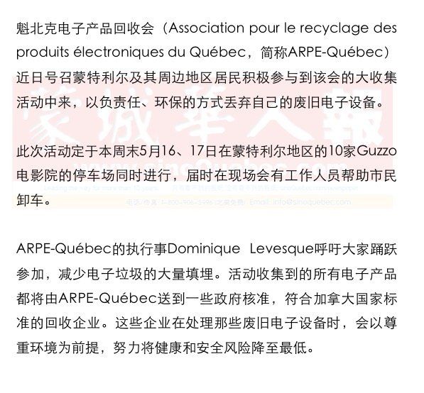 废旧电子产品被拆开后,它们所包含的一些有用材料如金属、塑料和玻璃等,会被分拣回收、加工再造和重复使用,以制造出一些新的产品,最大限度地利用我们不可再生的自然资源。 Dominique Levesque指出,人类科技的发展日新月异,但我们的地球却脆弱而珍贵,因此以妥当、安全和环保的方式丢弃废旧电子产品就显得十分重要。自ARPE-Québec推行废旧电子产品大收集活动以来,已经减少了将近3万吨的电子垃圾填埋,这相当于6千头大象的重量。ARPE-Québec将继续努力提高市民对电子产品科学回收重要性的认识和大收集活动的参与性。Dominique Levesque还对Guzzo电影院提供的场地支持表达了诚挚的谢意。 ARPE-Québec在蒙特利尔市收集电子产品的具体时间是:5月16、17日的10点到17点 地点:Guzzo电影院停车场, MÉGA-PLEX TASCHEREAU 18 (IMAX), 3572, boulevard Taschereau, Greenfield Park. MÉGA-PLEX MARCHÉ CENTRAL 18 (IMAX), 901, Crémazie Ouest, Montréal. MÉGA-PLEX PONT-VIAU 16 (IMAX), 1055, boulevard des Laurentides, Pont-Viau, Laval. MÉGA-PLEX LACORDAIRE 16, 5940, des Grandes Prairies, Montréal. MÉGA-PLEX JACQUES-CARTIER 14, 1401, chemin Chambly, Longueuil. MÉGA-PLEX SPHÈRETECH 14, 3500, Côte-Vertu, Ville Saint-Laurent. MÉGA-PLEX TERREBONNE 14 (IMAX), 1071, chemin du Coteau, Terrebonne. MÉGA-PLEX DEUX-MONTAGNES 14 (IMAX), 2701, boulevard Des Promenades, Deux-Montagnes. CINÉMA DES SOURCES (IMAX), 3237, boulevard Des Sources, Dollard-des-Ormeaux. CINÉMA SAINTE-THÉRESE 8, 300, rue Sicard, Sainte-Thérèse. 本次活动收集以下产品:手提及台式电脑、电视机、视频游戏机、移动电话和寻呼机、收音机、录音机、CD播放机、MP3等其他电子设备。 |