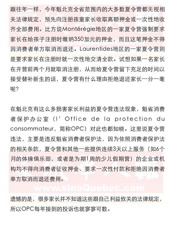 很多夏令营的做法跟消费者保护法都是背道而驰。按法律要求,如果消费者因个人原因在事前或中途退出,不管是出于什么理由,夏令营都应该全数或者在扣除押金后,按服务未使用比例退还剩余营费。夏令营收取的罚金可以是总营费的10%,或者是固定的50加元,两者中取最低值。但在实际运作中,一些夏令营仅同意给受伤或者被夏令营开除的孩子退还费用。 魁北克夏令营协会(l’Association des camps du Québec)的执行董事Eric Beauchemin称夏令营的那些做法并不是要有意为难家长,只是为了避免因大量预订在最后一分钟无正当理由取消而让夏令营陷入难以在短时间内找到替补新生的困境。Eric Beauchemin介绍说很多夏令营的规章和实际操作完全是两码事:尽管夏令营明文规定营费不予退还,但如果家长抱怨投诉的话,夏令营还是会把钱给人家退回去;遇到不能协商解决的问题时,就只能诉诸法律。 Eric Beauchemin认为现行法律有待修正,应该赋予夏令营对开营前10天取消注册的消费者收取罚款的权利,因为消费者此时取消注册会让夏令营产生退款以及找寻替补新生的额外费用。他认为,罚款合理金额是50加元。 其实OPC自2013年以来就在着手研究修改游戏规则的可能性,以便在继续保护消费者权益的同时,让夏令营组织者也感到满意。 以下为魁省消费者保护法明令禁止的一些做法: ◆收取押金 法律规定夏令营组织者不得在开营前向消费者收取任何费用。但事实上大多数夏令营要求家长在给孩子注册时就缴付一笔押金。 ◆一次性收缴营费 法律同样禁止夏令营组织者在开营之初就要求家长一次性地交齐全部费用。依照相关法规,营费至少应该分两次缴纳。 ◆费用征收后,不因消费者单方取消而退还 按照法律规定,不管家长出于何种理由,只要是在正式开营前取消孩子的注册,夏令营就必须百分百地退还所收营费。如果消费者在开营后因个人原因退出,夏令营则应在扣除罚金后,按服务未使用比例退还剩余营费。夏令营收取的罚金可以是总营费的10%,或者是固定的50加元,两者中取最低值。 消费者协会OPC投诉热线:1 888 672-2556 |