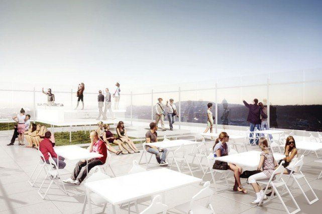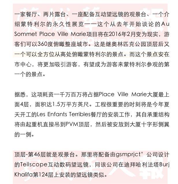 第45层将迎来一个先进的互动体验展览,向人们展示历史的蒙特利尔和当代的蒙特利尔。展览的目的就让参观者了解蒙特利尔在运动、美食等方面的出色表现以及重要的历史事件。这个展览是永久性的,但是内容将会不断变化。它将帮助游客了解真正的、真实的蒙特利尔以及蒙特利尔人眼中的蒙特利尔。 ![]() 第44层,包括Les Enfants Terribles餐厅,一片休息区和两个很棒的露台。餐厅位于东侧,而休息区和露台位于对面的西侧。 ![]() 毫无疑问,观景台的视野将会非常壮观。天气好的时候,甚至能够望到Vermont的Jay Peak山。 Gsmprjct°公司股东、项目投资人之一Alexandre Taillefer指出,他们真心希望通过在市中心的地标建筑之内打造一个拥有一览无遗视野的景点,来为蒙特利尔增加新的吸引力。他们还将整修露台,铺设可加热地板,让蒙特利尔人即使在冬天也能够登上露台尽赏冬日风景。 Au Sommet de Place Ville Marie项目将在明年2月份的隆冬时节正式向公众开放。 大厦有专门电梯直达大厦43层,项目入口将会设计成一个商业画廊。参观费用:成人14元,并提供家庭套票,儿童减价。总体来说,Au Sommet de Place Ville Marie观景台位于市中心,更吸引游客;而它的票价比城东的奥林匹克体育场蒙特利尔塔(La Tour de Montréal)的门票更加便宜。 但是,蒙特利尔奥林匹克公园公共关系顾问Cédric Essiminy对此并不感到担心。他认为,这是一个非常好的创意,将为蒙特利尔创造一个新的旅游景点。它并不是一个竞争者,因为,人们到蒙特利尔塔来通常还为了参与其它活动,那里是仅有的具有如此规模的休闲旅游中心之一。 Place Ville Marie大厦由享誉世界的华裔建筑师于1961年设计,全楼是十字造型,首创了地下购物区的观念,这是贝聿铭走向国际建筑设计舞台的开山作品。每天晚上,楼上旋转的探照灯,80公里以外都可以看得见。 |
