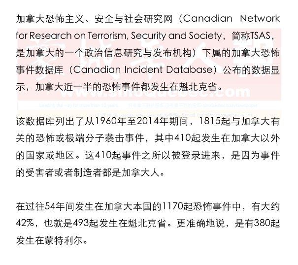 将魁北克跟加拿大其他省份彻底拉开差距的,是从1968年至1971年魁北克解放阵线(Front de libération du Québec,简称FLQ)运动期间所发生的141起恐怖活动。 就加拿大全国范围来说,有46%的恐怖活动与爆炸有关。发生在加拿大本国的1170起恐怖事件中,针对政府和企业的两类恐怖袭击各类均占16%,针对普通平民百姓的占19%,针对交通设施的占8%。 自上世纪80年代末以来,加拿大每年的恐怖或极端分子袭击事件数量都低于20起。在最近25年期间,与加拿大有关的恐怖或极端分子袭击事件大部分都在加拿大以外的国家或地区发生。 |
