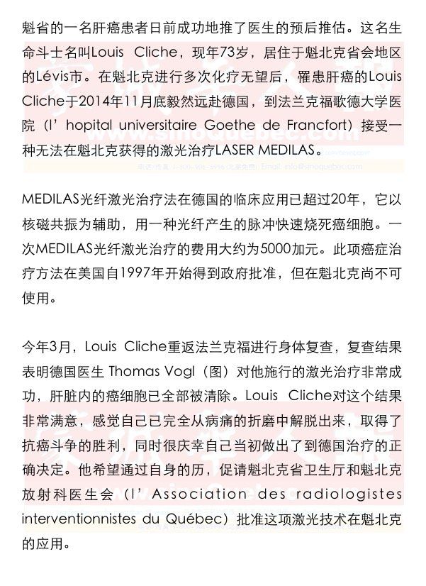 魁北克媒体去年报道了Louis Cliche的德国求医之旅后,魁北克全省各地的很多人就激光治疗肝癌一事向Louis Cliche进行了咨询,Louis Cliche总是耐心地有问必答,积极帮助那些跟自己有相同遭遇的癌症病患及其家人。从今年1月份开始,陆续有十四、五个魁北克人去德国求医,有些人还去了不止一次。 Louis Cliche介绍说,超过四分之三的肝部恶性肿瘤都不能通过手术根治,所以在魁北克,很多肝癌患者没有别的选择,只能接受副作用极大的化疗,一路化疗到生命的终点。 居住在Thetford Mines的15岁魁北克女孩Sabrina Pressé罹患一种在青少年中极其罕见而又发展极快的肝癌,医生在她的肝区发现了3个恶性肿瘤。据她母亲Lise Pressé介绍,Sabrina Pressé从2014年9月开始在魁北克接受一系列的化疗,但是到2014年12月初检查的时候,却发现肿瘤全都变大了一公分。就在一家人悲伤绝望之际,Sabrina Pressé的父母通过媒体了解了Louis Cliché在德国进行的激光疗法,他们立即联系了德国的Thomas Vogl医生,向其寻求医疗建议,之后便陪同Sabrina Pressé飞赴德国。Thomas Vogl医生觉得这个小女孩需要过一段时间才可接受激光疗法,所以先安排她进行肝动脉化疗栓塞治疗。Sabrina Pressé将在父母的陪伴下于6月底第四次到德国进行治疗。 Lise Pressé说他们每次到法兰克福的花费在2万加元左右,这对于他们这样的普通家庭来说不是一个小数目,但孩子的生命无价,现在只有激光治疗能给女儿以生的希望,所以花再多钱都值得。 |