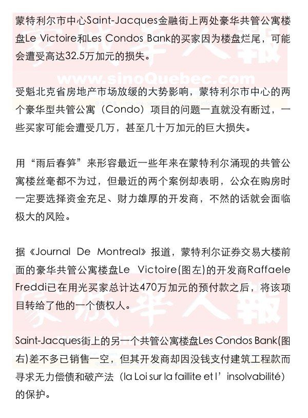 Le Victoire项目当初在楼花预售的时候承诺买家2014年12月入住,但从2014年秋季至今,该楼盘工地还是荒漠一般,连地基墙都没有完成。该项目的严重资金问题大部分缘于其主要贷款人,加拿大国民银行(la Banque Nationale)的撤出。开发商Raffaele Freddi在用完客户的所有预付款后,还欠债权人600多万加元,最后不得不将项目拱手让与对方。作为Le Victoire的新东家,Point Zéro Capital公司的Maurice Benisti正考虑将这个原设计为25层的公寓楼项目再次出售,他无所谓买家是谁,只要出得起600多万加元这个价钱就可以。 Maurice Benisti的律师Jason Hadid说Point Zéro Capital公司目前对Le Victoire项目尚无明确的计划,如果能按目标价位卖出自然是最好,但是也不排除自行留用的可能性。如此看来,Le Victoire项目也许会落到一个与该项目完全无关的投资人手上,假如真是那样的话,已经缴纳预付款的那些购房者的利益便会失去所有保障。 Raffaele Freddi这边似乎又有一个利好消息,他说他现在已经和多伦多的一个开发商达成了共同向Point Zéro Capital公司赎回Le Victoire项目的口头协议,一旦协议正式签署,他就即刻同Maurice Benisti进行商谈。 跟Le Victoire项目在同一条街上的楼盘Les Condos Bank的情况要稍好一点,它的14层楼(共计43个单位)已修建完毕并且住人,但其中11个单位的销售却因楼盘开发商la société en commandite Condominiums Bank跟工程总承包商Devlor建筑公司之间的债务纠纷而受挫。 开发商在今年1月份因没钱支付建筑工程款给分包商而宣布寻求无力偿债和破产法的保护,Devlor建筑公司随后对其提出了大约430万加元的诉讼,法庭于今年3月做出判决,授权Devlor建筑公司收回Les Condos Bank的部分单位。 Devlor建筑公司总裁Benoit Laurin指出Les Condos Bank项目从一开始就存在着资金不足的问题,但他确保会尽力做好开发商和其他债权人之间的协调工作,争取尽快找出一个解决方案。 魁北克省房地产市场的明显放缓对于Le Victoire和Les Condos Bank这样脆弱的项目来说,无异于压死骆驼的最后一根稻草。Raymond Chabot Grant Thornton会计师事务所负责Les Condos Bank一案的Jean Gagnon认为,如果Les Condos Bank的所有单位都按原定售价毫无折扣地卖出,那么开发商应该就能够清偿所有债务,可惜天不从人愿。在Jean Gagnon看来,也许最后会由购房者为开发商的部分债务买单,如果这种最糟糕的情况出现,Les Condos Bank整个楼盘的40来个业主最高可能需支付32.5万加元给工程总承包商及众分包商。 Les Condos Bank项目负责人Stéphane Brault说他目前正努力工作以寻求合理的解决办法,尽量避免让购房者受损失,工作进展还算顺利,具体情况会在一、两周后对外通报。 |