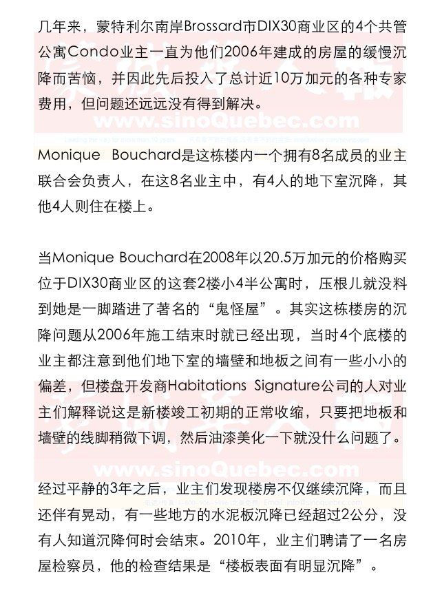 Monique Bouchard说她们在最近几年来没有一天不为房子的沉降问题发愁,甚至害怕有朝一日自己的家门槛会与地面相接,但她在问题面前却只能干着急,根本就找不到解决办法:按照相关规定,对于这有问题的房屋,业主不能一卖了之,也不能申请破产,更不能隐瞒房屋风险将之出租,所以只能在那儿干耗着。而房屋沉降问题的罪魁祸首,就是工作粗枝大叶的建筑商。 Monique Bouchard今年65岁,她从7年前就开始因为房屋沉降问题跟建筑商、新建房屋质保计划管理人、仲裁员和5个律师(这些律师由业主们联合聘请,相继在受聘之后被解聘)进行多方交涉,到现在却还是一筹莫展。在共管公寓问题专家Yves Joli-Cœur律师看来,Monique Bouchard及其他同楼业主遭遇的情况确实让人难以置信,但却绝非个案。 从2010年至今,业主们先后聘请了几个律师,第一个律师自行辞职,第二个律师因工作能力不够而遭解聘,第三个律师因收费高昂却无所作为而被“炒鱿鱼”,其他两个“后来人”的情况也都差不多这样,反正业主们就没能碰到一个称心的好律师。 2011年,业主们花大价钱请土木工程师做出了一份评估报告,报告认为楼房地基的填充土料选择不当而且没有夯实,所以导致下面积水。一名建筑专家甚至发现在水泥板下有一个2米深的洞。在投入了近10万加元的律师费及房屋专家评估鉴定费后,业主们终于从有关方面得到了一些答复。 业主们最关心的问题是:既然房屋沉降的责任人是建筑商,那么他们为什么不对房屋进行修理?根据专家对修理费用高达数十万加元的预估来看,这绝不是一个小责任。 在经过几年的斗争之后,建筑质量纠纷仲裁员不久前给出这样的答复:那是因为业主们没有在新建房屋质保期内提出申诉。按照相关规定,业主们应在发现问题严重性之后的6个月时间内提出申诉,但他们却拖到了第10个月。 Monique Bouchard徒劳地辩护说,业主们之所以错过申诉有效期是因为最开始的检测报告没能让人看出问题的严重性,而且狡猾的建筑商一直从中敷衍和拖延时间,导致无经验的业主们犯下没有及时申诉的“重大错误”并为之付出高昂的代价。 仲裁这条路走不通,业主们决定向魁北克高级法院提起司法诉讼,要求有关责任方赔偿他们近50万加元的损失。但要拿到法院的判决,还得耐心地等上好几年。 Monique Bouchard对前景毫不乐观,她担心业主们没有财力支持,不能将维权斗争进行到底,同时还担心建筑商在法院判决下达之后宣布破产,那时候就真是走投无路了。 那么本案的过失方到底是业主还是建筑承包商? Yves Joli-Cœur律师。Yves Joli-Cœur律师认为,这个悲惨故事的原始过失方应该就是未在有效期内进行申诉的业主。他对业主们陈述的种种问题(比如说建筑商采用不恰当的填充土料,以及假意敷衍和拖延时间而致使业主错过申诉有效期)都表示理解,但他强调房屋质量纠纷一直得不到解决的根源就是业主们未在有效期内进行申诉,他同时希望能有专门的保险来承担业主们的无心之失。 楼盘开发兼承建商Habitations Signature公司的主要股东Normand Lamoureux对媒体辩称自己并不是业主们所说的奸商,他说每次跟业主聘请的律师基本达成协议时,业主联合会就会变换律师,令谈判中断,另外业主们总是不愿意让Habitations Signature公司对房屋问题进行自行检测,所以承建商一直不能确定自己是否应该为楼房的质量问题负责,也就谈不上对房屋进行修理。 Monique Bouchard对此的回应是经过多年的忽悠之后,Habitations Signature公司已经失掉了业主们的信任。争论无果,双方最后只能到法庭上见,而Normand Lamoureux也很乐意让法官去断案,因为他对建筑质量纠纷仲裁员的专业性没什么信心。 在房屋质量纠纷解决之前,共管公寓一概不得转手出售,业主们和Normand Lamoureux对这一点非常清楚。Normand Lamoureux说Habitations Signature公司并不是很差的建筑商,他们在DIX30商业区已经前前后后修建了共计2000个单位,如果施工质量真是很糟糕的话,应该一早就被曝光了。 |