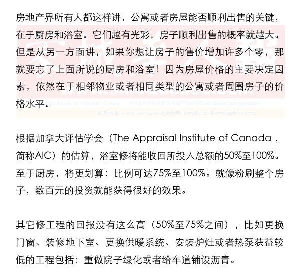 回报率最低的工程有哪些? 安装家庭影院、栅栏或者游泳池,只能收回投入的四分之一。更糟糕的是:带有游泳池的房子反而会令某些购房者却步! 尽管有些翻新花费巨大,需要支出15000元到25000元,但是能够换来配备全新不锈钢电器的最新式厨房。用7000元至10000元的预算,浴室就会改头换面,不用再去羡慕电影中明星们光顾的水疗中心了。如果没有这么多预算,那么就仅在厨房或浴室安装新的花岗岩、可丽耐材料或石英台面,更换洗涤槽、浴缸、瓷砖、厨房挡板或橱柜。 如果预算更加有限,那就粉刷一下墙壁、更换瓷砖,如果可能,更换台面和洗涤槽。有时候,仅仅是更换新的水龙头就会产生不一样的效果。 将家里的地毯更换成实木或者软木地板也会更为吸引买家。投入每平方尺4到8加元的预算(加上手工费乘以2)在销售中将会产生大约75%的“回报”。有些复合地板看起来同天然木地板一样漂亮,花费更少,而且安装简易。 重要建议:保留所有装修工程的所有发票,即使是多年以前的装修发票也不要丢弃。它们将会向评估人员和买家证明你用于装修的花费和材料。尤其是那些含有长期保修的发票(热泵、屋顶、地基,等等...)。同时保证通风/供暖系统同房屋完全相符,特别是如果浴室进行过扩建之后。 建议 虽然更换新的屋顶对于房屋出售来讲帮助甚微,但是屋顶状态不佳也会令买家却步。 不用考虑储藏室和阳光房,除非房子的要价在50万加元以上。 天井、天窗、和水疗浴缸通常对房屋出售没有什么帮助。 重新粉刷屋檐、阳台、栅栏,甚至房子的外立面,根据所付出的努力和预算的多少,都会在卖房子的时候带来相应的好处。 |