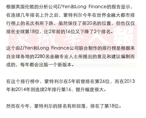 今年在排行榜上超过蒙特利尔的分别是德国的法兰克福和卢森堡首都卢森堡市,后者也是今年金融大都市排行榜前20名当中进步幅度最大的。 在加拿大国内,蒙特利尔排名第3,排在前面的是世界排名第11的多伦多以及从去年的第17位提高到15名的温哥华。 另一方面,阿尔伯塔省的石油之都卡尔加里则受到了去年的油价大崩溃的影响,在排行榜上兵败如山倒。此前连续2年在全球金融大都市排行榜上排名第17位的卡城今年仅仅排在第33名。 在整个北美洲,蒙特利尔在17座被评为金融大都市的城市当中排名第8,排名也比去年有所下降。 在参与调查的金融专家写给每座城市的评语当中,蒙特利尔保留了“跨国级金融中心”的称号,获得同一称号的还有美国的芝加哥以及波士顿。 相比之下,即使在全球排行榜上排名比蒙特利尔靠前,温哥华所获得的称号也不过是“地区级金融中心”。另外,卡尔加里获得的称号是“地区级专业领域金融中心”,这是由于这座城市在石油和天然气领域拥有极为突出的优势。 另外,多伦多毫不令人意外的获得了“世界级金融中心”的称号,也是加拿大唯一获此称号的城市。在整个北美方面,也只有美国的纽约获得了同一级别的称号。 蒙特利尔的金融及经济促进团体认为,蒙特利尔在该排行榜上排名的变化说明了持续以正确的方式识别和发展蒙特利尔作为一座金融大都市的独特优势的重要性,而不是一味的努力发展成为伦敦和纽约那种国际金融中心。 |
