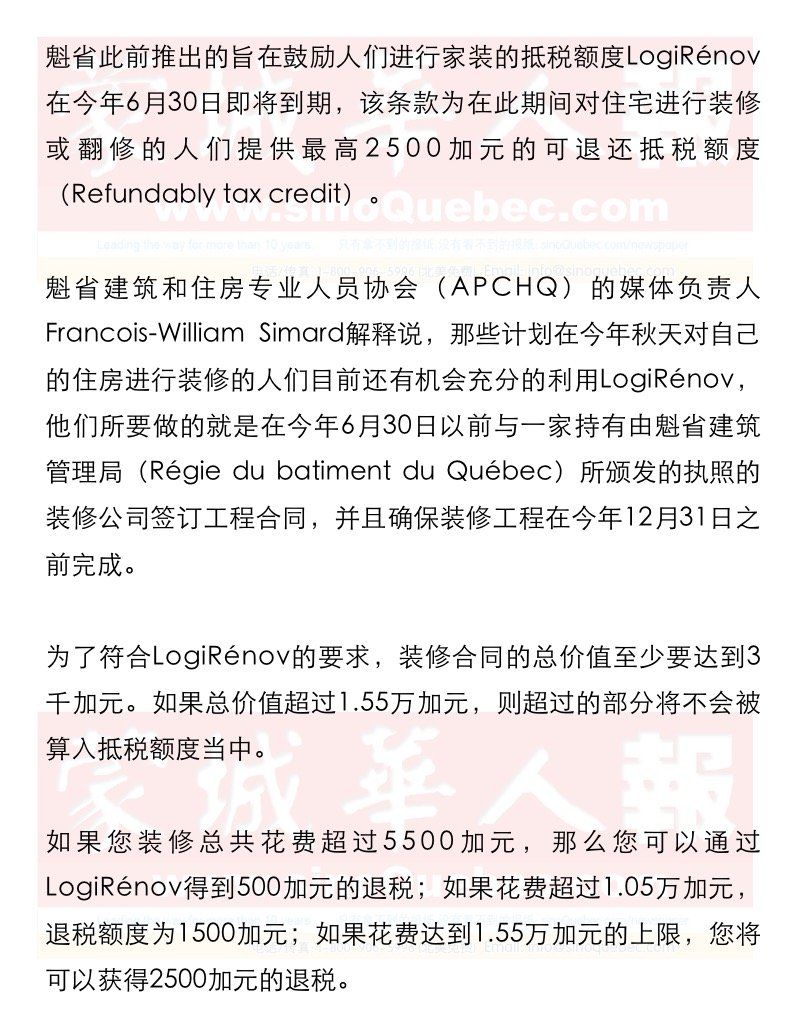 在魁省税务局(Revenu Québec)的网站上,对LogiRénov的解释是这样的:该项目旨在帮助人们装修他们的主要住宅,包括扩建、按照家庭中某个成员的需求进行改造或是将住房改造成可容纳一个大家庭的大型住房。魁省网站:http://www.revenuquebec.ca/en/citoyen/credits/logirenov/ 至于具体哪些类型的工程符合LogiRénov的退款标准,您可以在魁省税务局的网站上找到完整的列表。 下面是几个例子: · 对住房内一个或多个房间内部的装修 · 装修地下室 · 更换地面的保护层 · 更换下水系统 · 重做屋顶 · 更换房屋外部壁板或是排水渠 · 更换房屋用于排屋的软管,或是更换卫生间、屋外以及地基中的排水系统 在计划对自家住宅的装修工程时,您不妨考虑响应此前魁省政府的退税计划EcoRénov的号召,使用更多环保型的建材,其中包括更换房门或是窗户、更换房屋的隔热层或是暖气系统、更换热水器或空调系统等。 为了从LogiRénov中受益,您需要: · 从魁省税务局的网站上下载LogiRénov退税表,填好之后将其加入到下一年的报税表格当中。 · 要求您的装修工程承包商完整填写并签署表格Attestation de conformité de biens à des normes écoresponsables (网站:http://www.revenuquebec.ca/fr/sepf/formulaires/tp/tp-1029_er_a.aspx )。 · 要求您的装修工程承包商提供一份详细文件,明确标注着装修工程的各个细节以及每个环节的费用,以便帮助魁省税务局决定哪些费用符合LogiRénov 的退税标准。 · 在工程完工后6年之内保存所有的辅助文档(预算表、估价单、账单等),在魁省税务局稽查的情况下作为证据提交给后者。 |