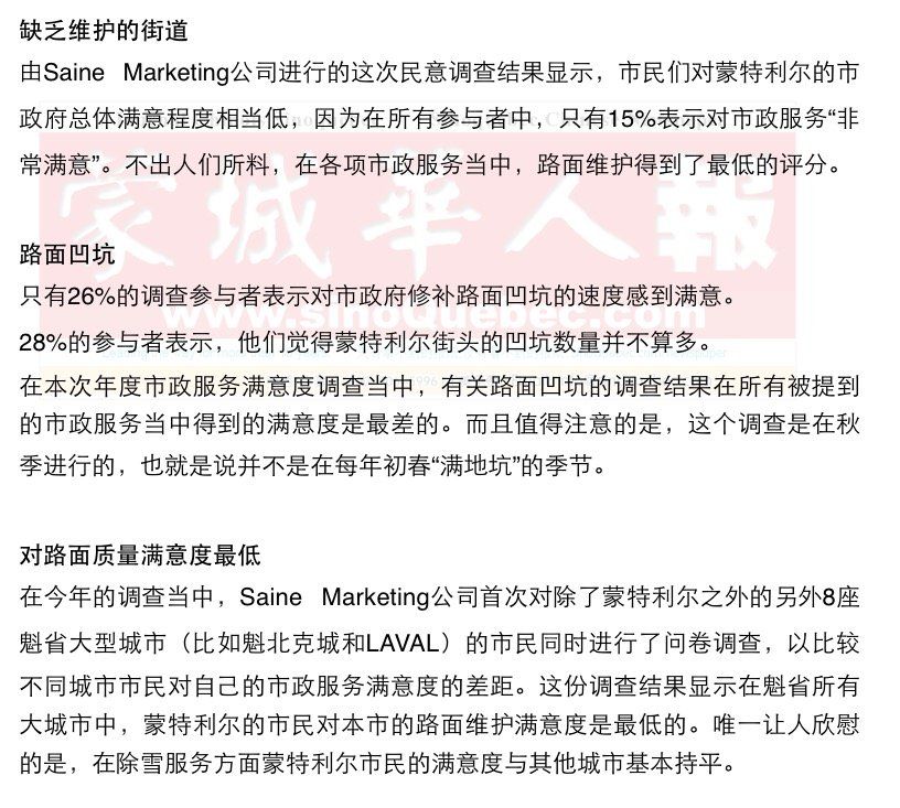 根据最近一次关于蒙特利尔市政服务质量的民意调查显示,市民们对蒙特利尔路面上出现的大量凹坑以及修补这些凹坑所花费的时间感到无比愤怒。民意调查还显示,相比魁省的其他大型城市,蒙特利尔的居民们对本市的市政服务满意度更低。 本次市政服务满意度调查的结果是由市政府委托Saine Marketing公司进行的2次民意调查的结果中得出的。其中,第一次调查是以电话的方式,在2014年9月22日至10月18日期间对1907名蒙特利尔居民进行问询而得出的,其中每个城区各被调查了100人。第二次调查则是用于比较魁省9大城市(蒙特利尔、魁北克城、Laval、Gatineau、Longueuil、Saguney、Lévis和三河市)的居民对本市市政服务的满意度。该调查于2014年10月3日到21日期间在网上进行,总共有1054人参与了调查。蒙特利尔市政府于去年12月8日得到了问卷调查的结果,但是为了“更好的进行分析”,市政府等待了7个月才将结果公之于众。 |
