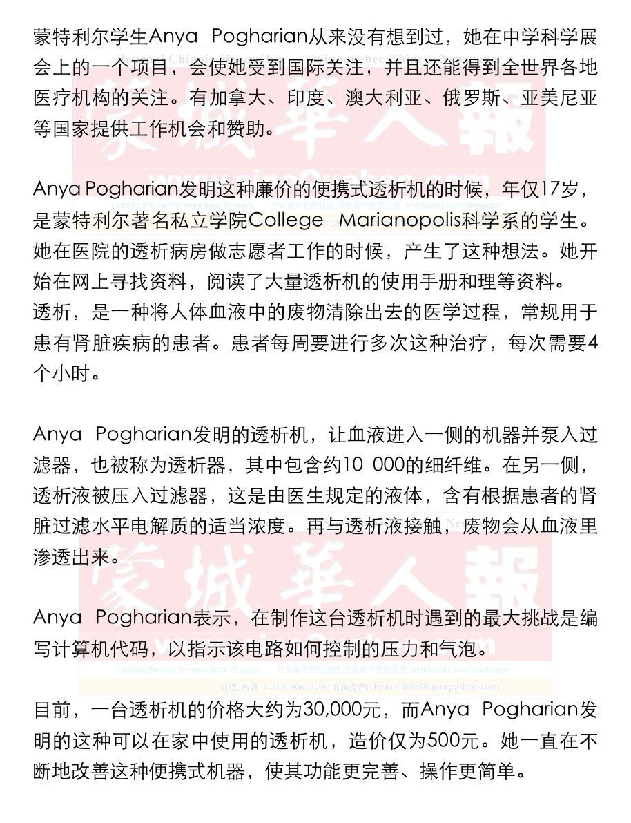 负责管理魁省血液产品以及人体组织并确保血液供应安全性的非盈利组织---魁北克血液中心(Héma-Québec),为Anya Pogharian提供了一个实习职位,可以让她使用真正的血液来试验原型机。当时,Pogharian和她的团队希望这种便携式透析机能够在两个半小时内过滤4升血液,但实际仅仅用了25分钟就完成了整个过滤过程。 她说,这种机器高效、简单,便携易用,使它成为发展中国家和灾难地区的理想产品。而且,这种机器还可以让人们和自己的家人联系地更紧密。 Anya Pogharian的这个发明多次获奖,在泛加拿大科学竞争中获得铜牌,并获得渥太华大学的奖学金。 一位名叫Philippe Ouaknine的患者表示,透析治疗通常是每隔一两天就要进行一次,每次都要用好几个小时,这不仅使他无法工作,而且也让他和自己的家人见面成了问题。他的母亲居住在另外一个城市,所以每次去探望,他必须要计算时间,以便确保自己能及时地赶回来进行治疗。Ouaknine表示,市场上的确有家用型的透析机,但是价格非常昂贵,而且很难通过魁北克医疗保健系统得到。他说,Anya Pogharian的发明,将会彻底改变需要进行血液透析的患者的生活。 这也正是Anya Pogharian所期望的事情。她理解患者有多么困难,简直不能想象他们每天必须要依靠机器来维持生命的这种生活。她希望,自己发明的这种便携式透析机能够在两三年之内投放市场。 |