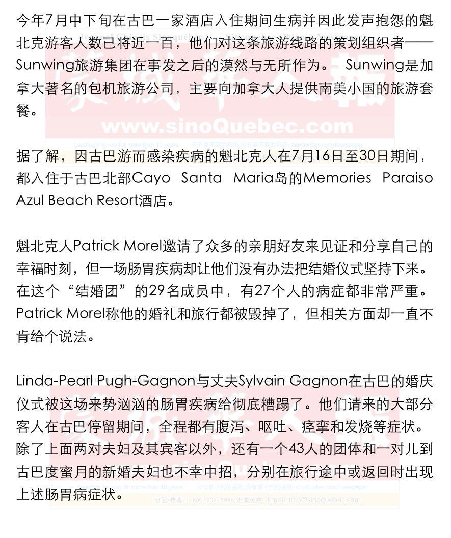 负责Sunwing旅游集团营销工作的副总裁Janine Chapman拒绝透露他们公司在古巴感染肠胃疾病的游客总人数以及赔偿金的总额度。 在她的电子邮件中,Janine Chapman指出Memories Paraiso Azul Beach Resort酒店给客人提供的水不应该是疾病的感染源,因为该酒店的水的来源跟Cayo Santa Maria这座旅游城市中的其他酒店完全一样。但Janine Chapman同时也承认,染病的客人并没有去到其他什么可疑的地方。 |
