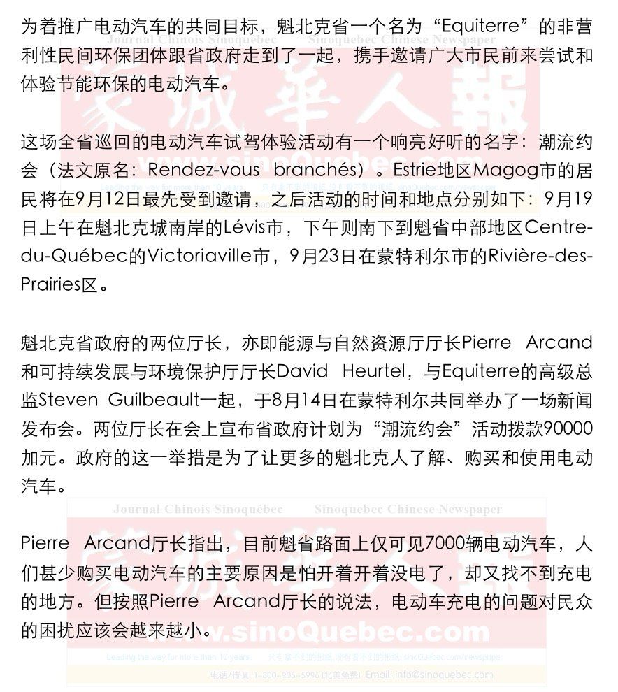 如今在40号高速公路上已经有了一些充电桩,紧接着在20号高速公路上也会装一些,魁北克地区已经有了,蒙特利尔市内及其郊区的充电桩更是越来越多,所以说驾驶电动车出行正变得越来越方便。 Equiterre的高级总监Steven Guilbeault进一步补充说,魁北克全省范围内目前总共已为电动汽车装有400多根公共充电桩。 人们在“潮流约会”活动中不单是可以试驾和亲身体验电动汽车,还能够得到专家的现场解释和答疑。专家将通过有力的论据让人们信服,购买电动汽车的确是一项明智之举,既省钱,又环保。 Steven Guilbeault在新闻发布会上还澄清了民众对电动汽车的一些错误认识,其中最主要的就是很多人都因为电动车比传统汽油车的售价要高而觉得买电动车不划算。按照Steven Guilbeault的估算,只需要三年时间,使用电动车而节省下来的钱(主要是汽油费)就可以把电动车跟汽油车的购买差价抵回来。 此外,Pierre Arcand厅长还说他的同僚,省交通厅(Ministère des Transports)厅长Robert PoEti将在几周后向省议会呈交一份电气化交通政策提案。 |