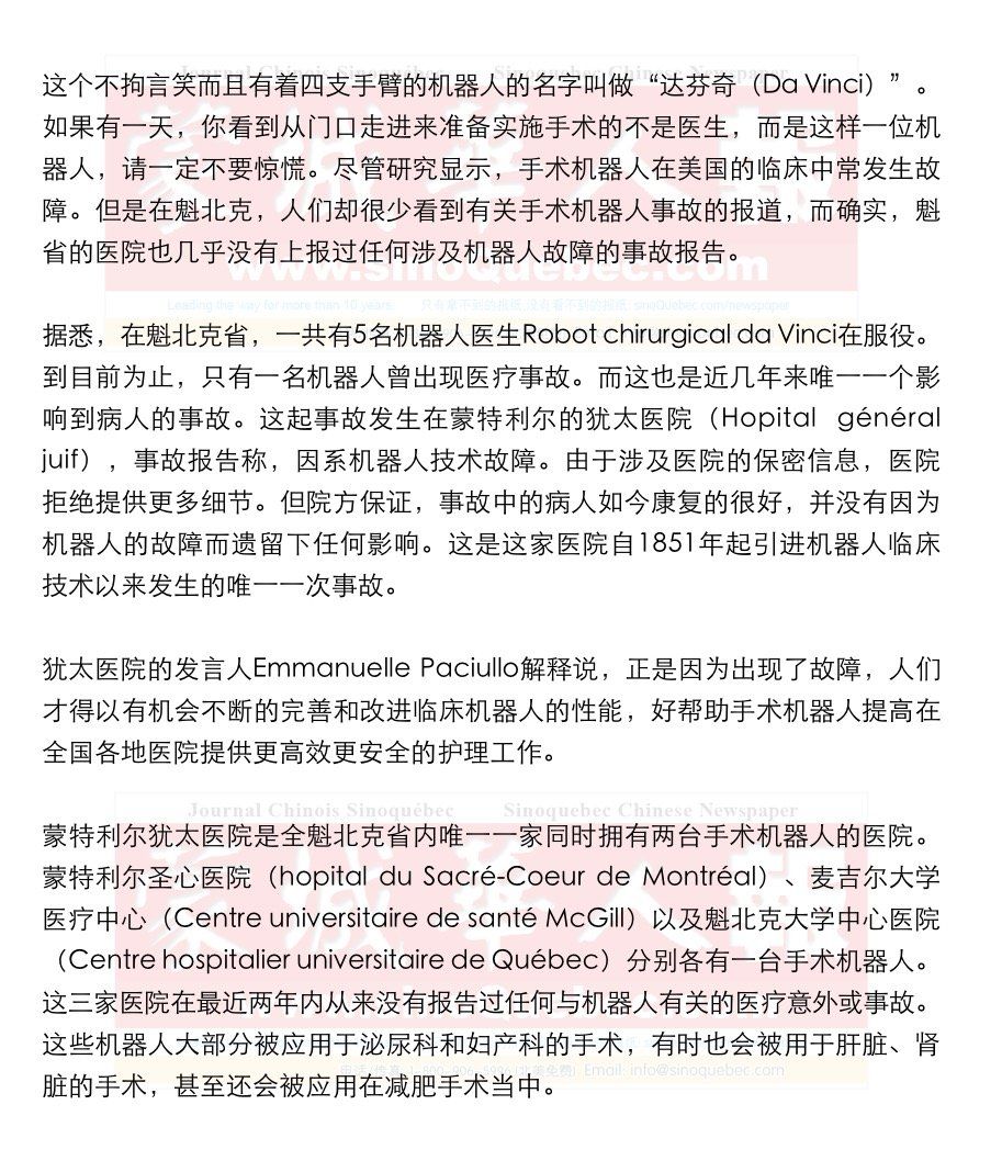 就在上个月,来自麻省理工学院(Massachusetts Institute of Technology,简称MIT)的美国研究员们完成了一项专门针对机器人在美国临床医学中的使用效果的研究。结果显示,在最近的14年中,手术机器人在美国至少造成了144人死亡,近1400人受伤。 病人被割伤、医疗器械掉落在病人体内、漏电导致灼伤等等。该报告罗列出了大量与手术机器人相关的医疗事故实例,而且事故发生率之高令人乍舌。 一名研究员表示,在调查过程中,他认为实际生活中涉及手术机器人的医疗事故可能更多,因为在美国,医院并没有义务报告每一起医疗事故。 不过,这种情况在魁北克完全不可能发生。因为魁省政府要求医院必须上报每一次医疗事故。这些报告都必须严格遵循特定的格式,并被统一按照事故类型和涉及事故的医疗设备来分类整理并保留存档。当然,这样做可能会导致医院在事故发生后要花费几天的时间来完成报告,如果情况复杂,则更有可能需要几个星期的时间才能完成报告。 蒙特利尔圣心医院(hopital du Sacré-Coeur de Montréal)手术室主任Ronald Denis医生对美国研究员得出的结论表示震惊。他说,他和手术机器人一起合作已经至少10年了。在他的从医生涯中从未见过像美国医院中发生的机器人掉落医疗器械到病人体内,或是机器人漏电灼伤病人这种事情。 Ronald Denis医生解释说,如果医生在使用机器人的过程中遇到困难,销售机器人的公司会指派一名工程师来医院,全程监视每一次有机器人参与的手术。所有外科医生在使用机器人接触病患之前,都必须接受并通过一系列的操作强化训练。在开始接手复杂病例之前,团队们必须从简单的手术开始做起。据Denis医生称,正是这些严格的措施保证了医院迄今为止并没有发生过一起与手术机器人相关的医疗事故。 值得注意的是,Intuitive Surgical公司是魁北克省一家销售达芬奇型号手术机器人的主销商。自2003年起,加拿大17200起手术死亡报告中(其中5611起来自魁北克省),该公司并没有收到任何一例与达芬奇机器人有关的索赔。 魁北克大学中心医院(Centre hospitalier universitaire de Québec)的发言人Pascale Saint-Pierre指出,美国开始使用机器人进行临床的时间要比魁北克早得多。 手术机器人的好处: 有效避免多个创口(机器人可以在微创的情况下进行手术操作,否则病人可能需要在身体多个位置大面积开刀) 减少病人的手术痛苦 有效缩小手术中的出血量 缩短住院时间 与传统的腹腔镜检查(通过手术切口将相机插入病人体内)相比,外科医生可以更好的在手术过程中观察自己的操作 有助于医院吸引并留住高水平的外科医生 坏处: 无法通过直观的触觉将病人的情况及时反馈给临床医生 |
