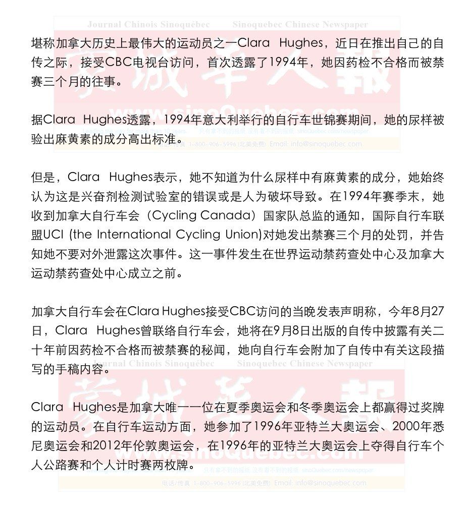 作为长道速滑运动员,Clara Hughes参加了2002年盐湖城冬奥会、2006年都林冬奥会、2010年温哥华冬奥会,赢得 2002年盐湖城冬奥会长道速滑5000米铜牌、2006年都林冬奥会长道速滑5000米冠军和团体追逐赛银牌、2010年温哥华冬奥会长道速滑5000米铜牌。 出生和成长在曼尼吐巴的 Clara Hughes目前长居魁北克省。指导她获得冬奥奖牌及诸多速滑锦标赛冠军的教练是来自中国的速滑名将王秀丽。 |