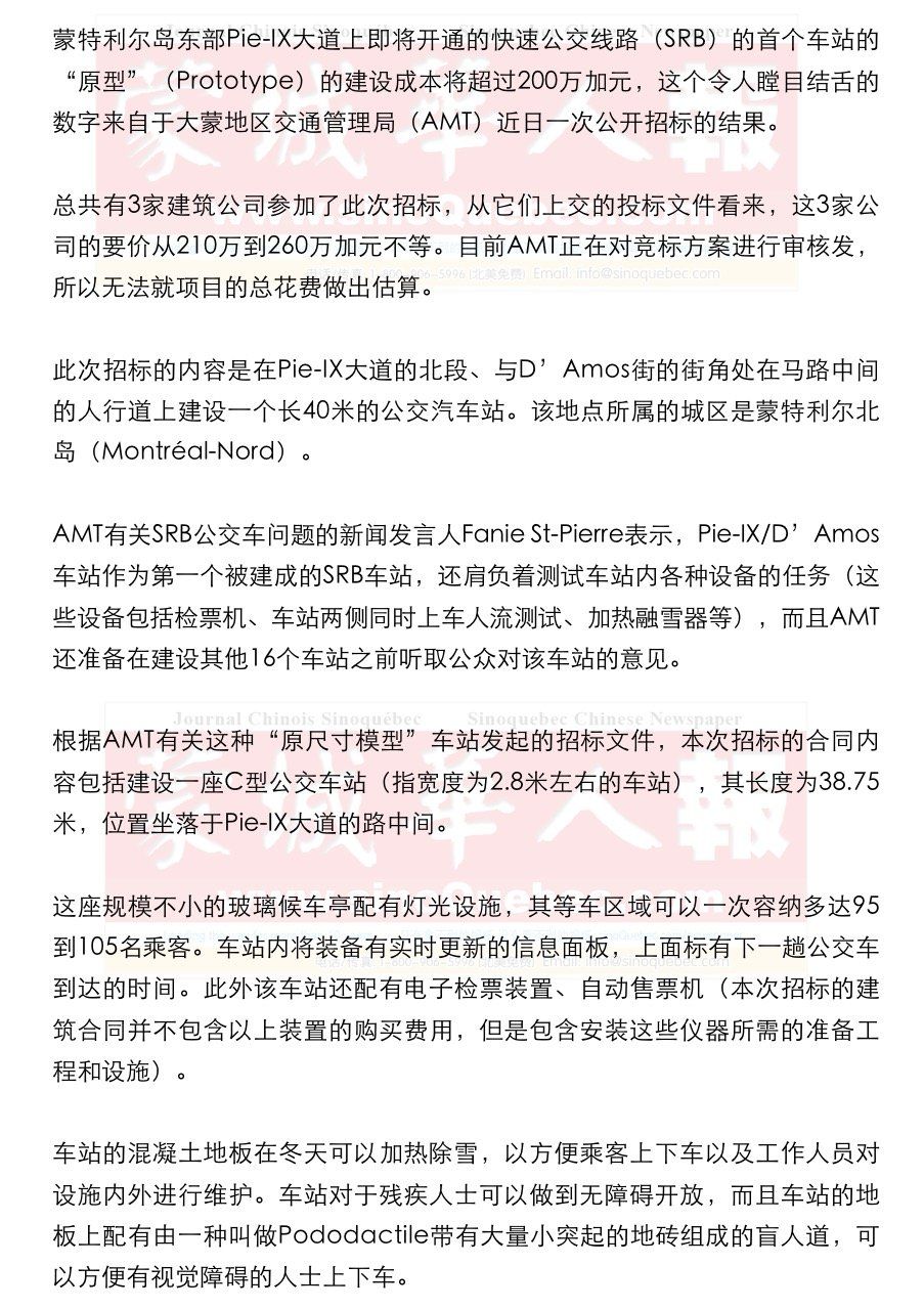 Pie-IX大道与D’Amos路的街角此前被完全重建,整个工程耗资5400万加元。工程的内容还包括在路中心修建了一块专门用于建设公共汽车站的土地,为未来的SRB车站留用。 AMT希望在2016年夏天结束以前将Pie-IX/D’Amos修建完成,此后直到2017年,沿着SRB的路线还会有16个类型相似的车站相继建成。AMT预计Pie-IX大道上的SRB公共汽车路线修建工程将于2020年全线完工。 Pie-IX/D’Amos车站一旦建成,将在魁省范围内创造几个记录。首先,它将近40米的全长将使它成为魁省最长的公交车站。其次,Pie-IX/D’Amos站也将成为魁省首个成本超过200万加元的公交车站。 根据电子投标系统(SEAO)中的搜索结果显示,传统的公交车站的建造成本相比之下简直不值得一提。其中,规模最小、最简单的公交车站成本在5千到8千加元之间,而类型更加现代、规模稍大的车站则要几万加元。 今年6月,离首都渥太华不远的Outaouais市的交通管理局刚刚与建筑商签署了一项为期4年的公交车站建设合同。合同内容包括49个公交车站的建设工程,其中2个在候车亭内配备加热设备,合同总金额只有75.6万加元。 8月,魁北克城的公交管理机构“首都运输网络”(RTC)刚刚签署了一份总价值5百万加元的合同,合同内容为在5年内建设250个全新的公交车站。这些新车站当中有一部分被成为四联车站(Quadruple),全长达到12米。对于RTC的这类大型车站的建设成本,目前还不得而知。 RTC还在近年来陆续修建了多座现代化公共汽车站,这些车站加装了封闭式的候车亭以及加热装置。这些新设备可以让车站内部在冬天最寒冷的时候维持零上5度左右的分度,让等车的人们可以更加舒适。其中一个目前正在建造的车站耗资较高。该车站位于Charlesbourg的第一大道和41号路街角处,其建造成本为74.5万加元。车站内部的面积为25平方米,与Pie-IX/D’Amos车站车站相比小了很多。 |