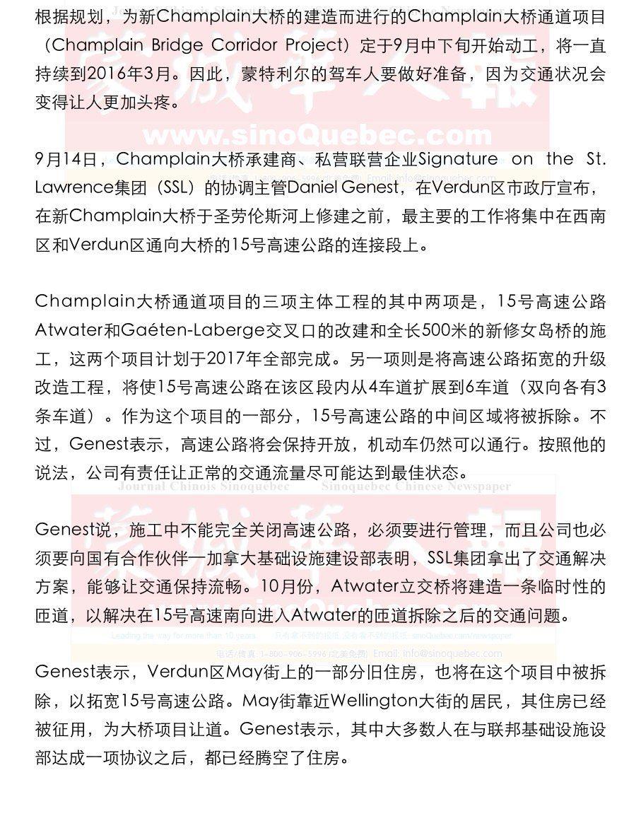 在15号高速公路Champlain大桥通道项目动工的同时,15号与20号交界处的交通枢纽Turcot立交桥也在施工中,因此,蒙特利尔的交通状况将会变得更糟。 Genest表示,到2016年的时候,这片区域将会有两个特大型项目全速施工,因此,对交通的影响将会更加显著。Turcot立交桥和Champlain大桥这两个项目,会同时在2016至2018年进行。 Genest表示,市民需要理解的是,他们用4年半的时间,就会得到一座新桥和一条新高速公路,因此,在看到成果之前,一定要有耐心。但是,对于一座新桥是否能够从本质上改善蒙特利尔交通困境的质疑,Genest表示,没有一个方案能够从根本上解决交通问题,但这是解决方案的一部分。 |