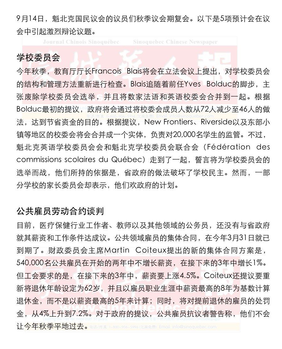 财政 Philippe Couillard领导的自由党政府,正在准备进行一场重大的税务改革。财政厅厅长Carlos Leiteo表示,他将会执行Godbout报告中提出的关键性建议。Leiteo说,这些关键性建议中最重要的,是降低魁省的个人所得税,同时上调销售税。这项计划有可能会在2016年实行。他说,这个想法是为了让魁北克人的钱包中能有更多的钱,这样的话,就可以刺激经济的发展。省议会反对党对这项计划进行了批判,他们辩称,贫困阶层和中产阶级将会受到最猛烈的冲击,而且销售税的上涨,很可能会使已经处在苦苦挣扎境地的工商企业更加受伤。 上个月,Sherbrooke大学的税务问题专家Luc Godbout还建议,提高电费费率和增加酒精、香烟和汽油的消费税。他说,税收的再分配,能够将可支配收入总额提升到6亿元。Leiteo可能会利用这个秋季的经济变化,来检查政府制定的目标。不过,最近公布的季度统计结果表明,魁北克的经济增长没有活力。 仇恨演说 魁北克司法厅厅长Stéphanie Vallée,将负责引领《59号法案》和《62号法案》在国民议会上获得通过。他首先要处理的事情就是仇恨演说问题,其次是要处理合理的可适应性调整的问题。针对向魁北克人权委员会(Quebec Human Rights Commission)报告或投诉仇恨演讲的人,《59号法案》提出了一种匿名的处理过程;该法案还将会赋予委员会新的权力,包括调查这种投诉的权力。魁人党俗世主义批评员Agnès Maltais表示,这项法案可能会给自由演讲带来影响。Maltais表示,她将会建议把《59号法案》一分为二。魁人党支持这项法案的第二部分,这部分的内容是针对强迫婚姻进行立法,为政府增加新的权力,来保护学生心理和人身安全,以及扩展儿童保护服务部门的职责。 魁北克主权 今年秋季,预计魁人党党魁Pierre Karl Péladeau将不会放过任何机会,在国民议会中大谈特谈魁北克主权问题。这位魁人党的新领袖一直誓言,要在2018年魁北克大选之前做好准备,开启独立机器,并且为魁人党的普通成员设立独立培训项目,并且成立一个单独的以这项议题为中心的应用研究机构。魁省省长Philippe Couillard则表示,今年秋季,对于主权主义者,他将“寸土不让”。 |