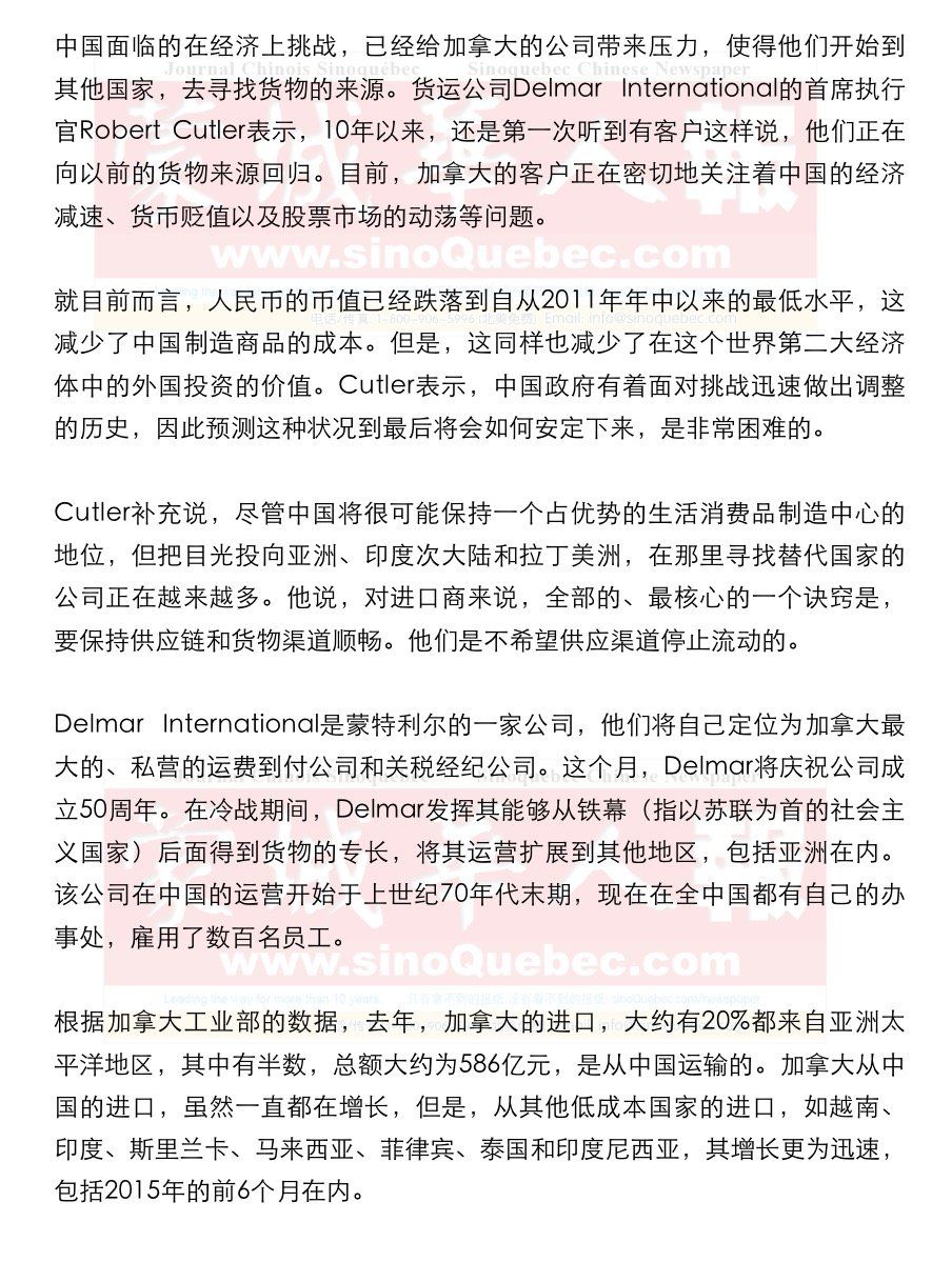 前联邦贸易部长Stockwell Day说,中国增长的不确定性将会产生不安情绪,这是可以理解的。但是他表示,这些前进道路上的波折,不足以抵消同中国做生意的利润。Day表示,任何生意人都会观望,但事实是,中国是一个如此巨大的市场,它仍旧会一如既往。Day现在在加拿大亚太基金会(Asia Pacific Foundation of Canada)中负责亚洲太平洋贸易事务,受人尊敬。他在温哥华表示,当中国制造的成本上升的时候,进口商自然就会把目光转向其他地区,但是,这里面还有更多的因素需要考虑,而不应该是简单地追求廉价劳动力。 魁省著名的“1元店”连锁Dollarama,在其货品来源中,有超过半数的产品,来自北美之外的25个以上的国家,但主要是中国。该公司表示,他们还没有受到中国经济发展的逆向冲击。但尽管如此,该公司目前正在考虑,要将其所销售货品的最高价格从3元上调至4元,因为加元汇率大幅走低,对小额商品价格的影响,已经远远大于人民币贬值带来的小小的利润。Dollarama的首席执行官Larry Rossy在不久前的一次电话会议中指出,就廉价产品而言,这些地方仍然是最好的供应来源。 |
