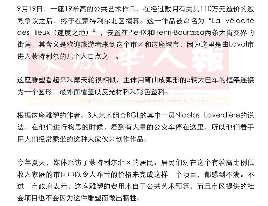 蒙特利尔市长Denis Coderre在雕塑落成揭幕仪式上表示,现在,当人们来到蒙特利尔北区的时候,将会见识到这个地方的文化。 艺术家Nicolas Laverdière说,有人喜欢,也会有人不喜欢,这是个人喜好问题,事情总是这样的。人们能够讨论文化的这个简单的事实,正是成熟、有深度和有理解力的一种迹象。他表示,能够理解人们的不满,但在同时也非常高兴,因为人们会看到自己被投射在了这个雕塑上,这在公共艺术作品中是不多见的。 |