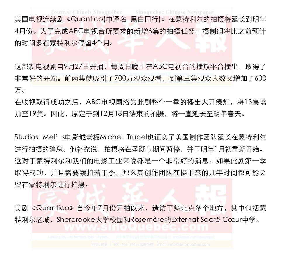 10月16日,Notre-Dame-de-Grace区的居民们饱有眼福,有幸看到《Quantico》摄制组正在拍摄第8集中一个特别爆炸的场面。当时,Rue Sherbrooke Ouest大街和Avenue Old Orchard大道的交口变成了临时剧场,人们围观观看FBI特工袭击一所房子,随后演变成枪战。房子的窗户被打成碎片,由Jack McLaughlin扮演的剧中人物Ryan Booth从房子里跑出来,衬衫上沾满血迹。 32岁的Priyanka Chopra因在该剧中出演主要角色,成为宝莱坞第一位在美剧中担当主演的印度女演员。尽管在大西洋这一边几乎无人知晓,但是她在自己的家乡是一位真正的超级巨星。在《Quantico》中,她凭借自己的形象特点饰演Alex Parrish一角,一位FBI新成员,但被怀疑为一次可怕的恐怖袭击的制造者。 |
