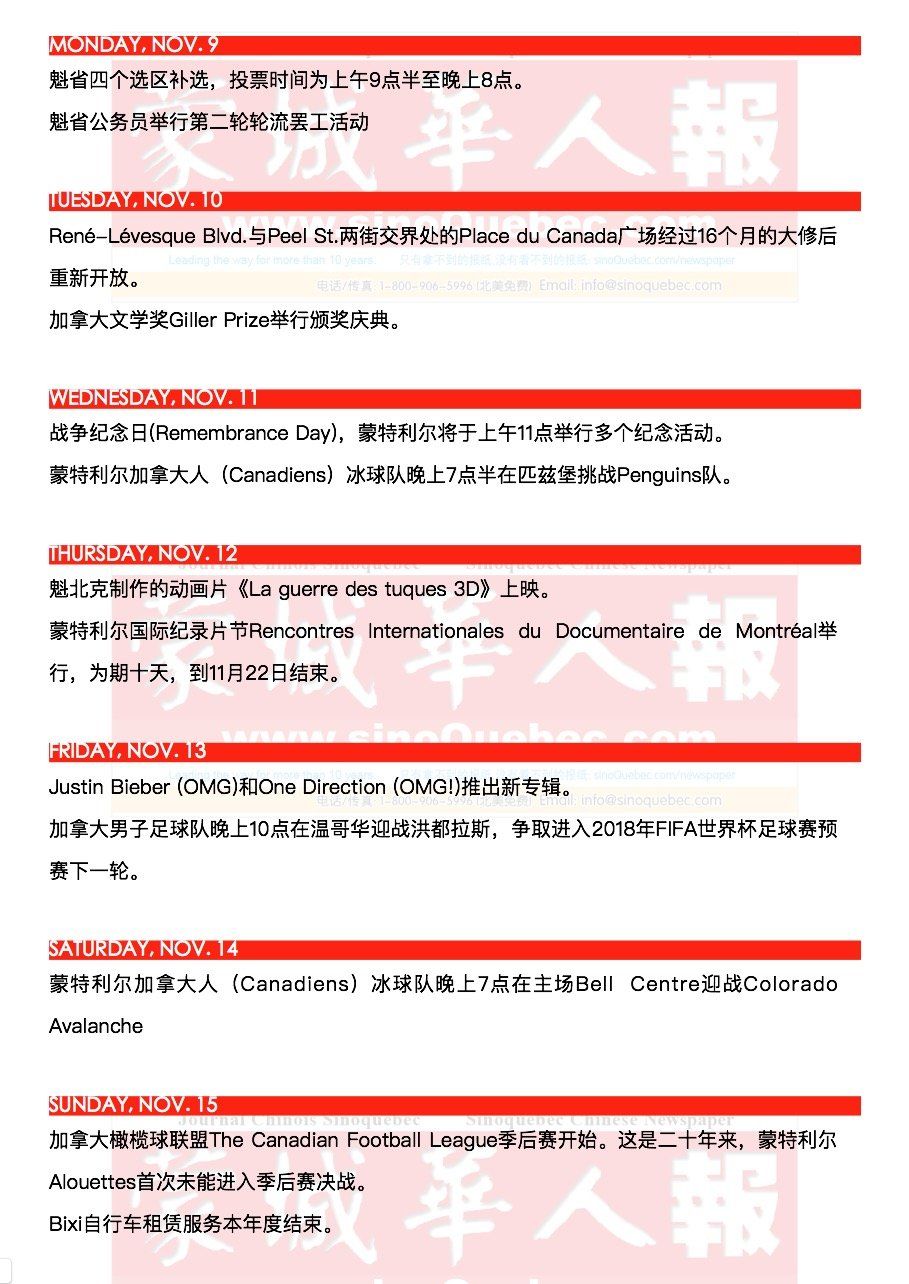 11月9日至15日蒙特利尔重要活动:魁省四个选区补选,魁省公务员举行第二轮轮流罢工活动;加拿大战争纪念日(Remembrance Day)。魁北克制作的动画片《La guerre des tuques 3D》上映。 |