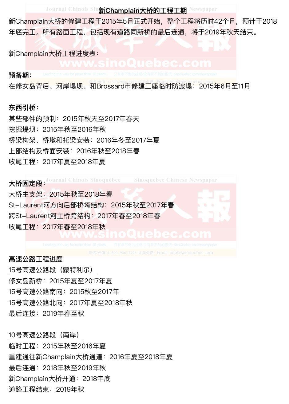 负责承建未来新Champlain大桥的私营方Signature sur le Saint-Laurent (SSL) 集团设立了一个新的网站,http://www.nouveauchamplain.ca/,从现在起,广大市民就可以通过它来了解大桥工程的进展情况了。通过访问该网站,能够及时找到有关Champlain大桥封路、施工影响,以及重要日期-比如工程进度时间-等信息。 按照工程计划,修女岛、西南城区以及南岸Brossard市相关地段将很快被标上特殊标签。同时,网站还会通过文字解释工程进展、工地状态、尤其是堤岸的使用。 SSL的联系方式以及获取更多信息的程序,网站都有详细说明;同时评论和投诉也可以在此提交。 一个专门的居民委员会不久也将会成立,在建桥过程中,市民可以通过该委员会投诉有关问题。 加拿大联邦议会的预算报告称,新Champlain大桥过桥费大致在2.6至3.9加元之间。 造价 新Champlain大桥将耗资42.3亿加元建设。加拿大建筑界巨擎埃森-兰万灵(SNC Lavalin)赢得了建造新桥的合同。据悉, 在3家投标的公司当中,埃森-兰万灵提出的报价是最低的。 设计 新Champlain大桥由国际著名的丹麦建筑师Poul Ove Jensen领衔设计。Poul Ove Jensen曾负责过30个国家大约200座桥梁的设计和工程,其中包括位于丹麦和瑞典之间的16公里长的Oresund Fixed Link大桥,美国旧金山的奥克兰海湾大桥(Oakland Bay Bridge),以及香港的昂船洲大桥(Stonecutters’ Bridge)等。 |