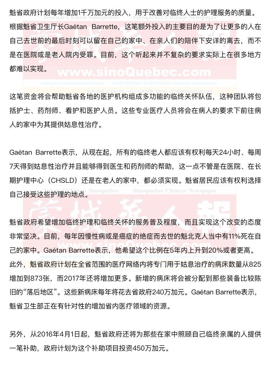 Gaétan Barrette解释说,魁省政府计划向每个拥有临终病人的家庭提供1千加元的额外补助,这笔钱可以用来支付护士或是护理人员的夜间或是周末的服务费用。同样的生活护理服务也可以向那些患病的儿童和青少年提供。 魁省政府为加强临终关怀服务而额外投入的这1千万加元显然与省政府近几年来所走的节省路线背道而驰,但是目前看来政府不会在健康领域的其他方面进行削减以维持财政平衡。 这项发展计划计划将在一项与临终护理相关的法令生效几天之后正式施行,该法案将于今年12月10日生效。 |