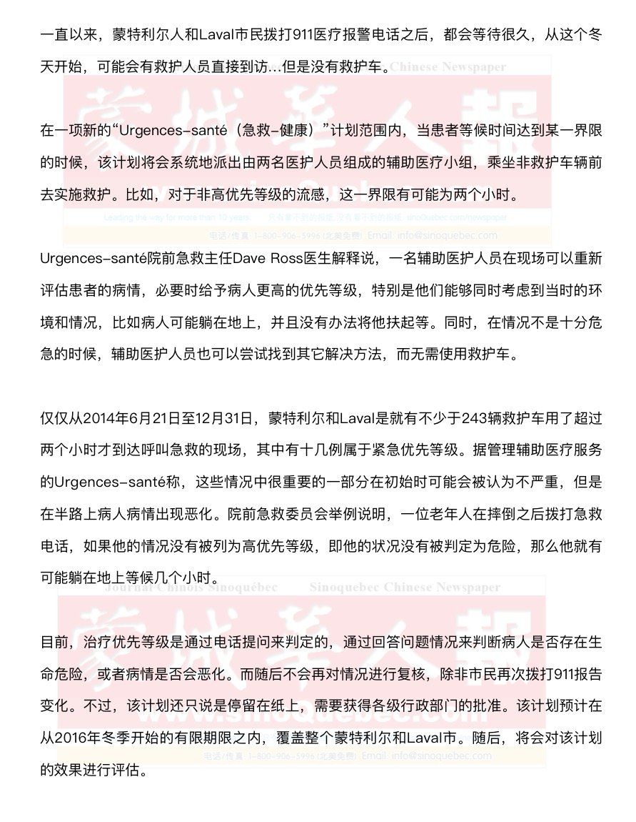 Ross医生强调,他们也正在制定省一级,就如何做第二次电话分级,以及除派救护车之外其它帮助方式的计划。 无救护车救护计划受到了蒙特利尔和Laval市辅助医疗委员会的欢迎,他们认为,在许多情况下,救护车到达都耗时太长。 院前急救委员会呼吁,为了派遣更多救护车和避免接到急救电话后耗时超过15分钟才能到达的情况,应该注入更多资源。由于这个要求未得到政府的积极响应,委员会成员从几年前就提出了许多解决方法来改进状况,其中之一就是,派出医疗小组进行现场第二次分级。 院前急救委员会主席Réjean Leclerc说,这样做可以复核病人的状况是否能够承受等待。如果能够避免派遣携带价值数万美元设备的救护车,也就做到了物质上的节省。只要没有削弱救护资源,这种做法就是积极的。 Réjean Leclerc认为,这样的程序也可以避免患者被等待所激怒,拨打911时夸大自己的症状。因为有的人明白,如果他们说自己呼吸不畅,那么自己的优先等级就会被列为紧急,尽管这并不是完全真实的。 另外,辅助医护人员每天都会碰到病情并不需要救护车而拨打911的病人。Leclerc先生举例说,一名女患者在电话中的描述,让医护人员认为她的症状是与中风有关的猝死性头痛,但是实际上她只是因为使用不当洗发水造成了头皮灼伤。 蒙特利尔大学医疗中心(CHUM)编纂的2014年全年和2015年截至10月15日的数据显示,大约1%由救护车运送至他们旗下三所医院的患者的急诊优先等级为5,也就是说,病情并不紧急。 同Dave Ross医生一样,Réjean Leclerc也判断,CHUM这个“无需急救”的运送比例是“被低估”的。Ross医生说,评估被救护车运送的患者比自己前来就诊的患者更为困难。急诊分级人员有可能会倾向于给予这些病人比实际情况更高的优先等级。Réjean Leclerc认为,实行急救现场分级可以消除这种错误消耗宝贵资源的现象。 |