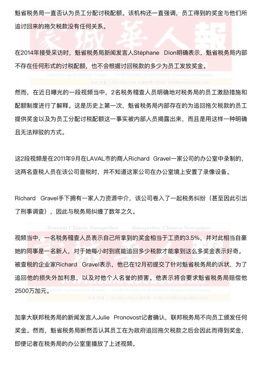 2名魁省税务局的税务稽查人员在一家企业查税时,在毫不知情的情况下被拍下一段录像,这2人在对话中承认,魁省税务局确实为员工们提供相当诱人的奖金,为员工按小时分配追回税款的配额。尽管魁省税务局否认有查税配额的存在,但是,事实已经击碎了民众对政府的信任。 魁省税务局被揭为员工制定查税配额 原载《蒙城华人报》 编辑/唐漠 视频: 她们到底说了些什么? 关于3.5%的绩效奖金: “去年,我的绩效奖金超级高。” “真的吗?你拿了多少?” “相当于我年薪的3.5%。” “我的天,真的吗?(模糊)” (模糊) “我不清楚。你平均每小时追回多少税?” “我也不清楚,因为今年是税务局自己计算的。” “你平均工资的3.5%?” “交完税之后,还剩……” “啊,当然了,还要交税。但是那也不少。” “恩,那也不少。” “是啊。但是第一年你没拿到奖金?” “没有,但是他们是根据财年来计算的,从每年3月到次年3月。” “哦,好吧” 关于配额: “他们要求你每小时追回多少?” “1000到1200,你们也是?” (点头表示确认) “我是个新人,才刚刚开始。” “在个人所得税部门?” (点头表示确认) “RAS(直接扣缴)也算在配额里。” “那是肯定的。” 税务局的新闻发言人Stéphane Dion在看完了一名税务局查人员吹嘘自己拿到了相当于年薪3.5%的奖金的视频之后表示,根据他们的理解,这是税务局员工对于税务局制度的误解。 Stéphane Dion表示,魁省税务局没有对旗下员工的工作目标给出过任何量化的要求,因此,配额制度根本不存在。这样的制度与税务局的道德准则背道而驰。另外,他还解释说,税务稽查人员追讨回来的拖欠税款的多少与他们是否有机会得到奖金没有任何联系。作为总结,他重申说,魁省税务局的税务稽查员们没有受到任何个人配额制度的约束。 然而,魁省税务局的解释并没有得到民众和舆论的认同。魁省税务局追查偷税漏税的战斗已经为政府增加了很多收入。 据悉,从2010年到2014年,通过税务审计收归国库存的钱飚升了65%,从每年23.5亿增加到38.9亿。 2010年,前财政厅长 Raymond Bachand在公布2010 - 2011年预算时,为达到平衡预算,他提出了加强打击逃税的努力。随后,前自由党总理Jean Charest宣布,税务部门将建立一个专门查税的新机构。伴随这一转变,魁北克授权税务局在三年时间内雇用了1100名新员工。占魁省税务局(Revenu Quebec)4400工作人员的三分之一。 在魁省税务部门发出查税通知后,大部分公司漏交的税款项都会被追回。据悉,在过去的五年中,魁省税务局追回的税款中有74%至82%来自企业;同一时期,追回的税款中有18%至26%来自个人。 在2014年至2015年追回的32.8亿税款中,有3.95亿元来自建筑业,4.09亿元来自餐饮业,1.77亿元来自中介行业。 伦理学家Donald Riendeau认为,由魁省税务局颁发给员工的奖金以及分配的逃税配额制度违背了税务机关的使命。根据Donald Riendeau,魁省税务局向税务稽查人员颁发奖金的做法可能会误导其员工,因为这些稽查人员将会把所有的注意力都集中在追讨税款的金额上,而无视被他们瞄上的公司是否有足够的证据为自己辩护。 Donald Riendeau表示魁省税务局和联邦税务局的工作方式有着巨大的区别。在魁省税务局看来,任何人、任何人在一开始就都是有罪的。而在联邦税务局,工作人员们会对每个案件进行调查。 Donald Riendeau还提醒大家,魁省税务局的口号一直都是“对所有人都公平”(Juste pour tous)。Donald Riendeau认为,魁省税务局的使命不应该是尽可能多的为省政府赚钱,而是要公平对待所有人。 税务政策专家、《La Crise fiscale qui vient》一书的作者Brigitte Alepin指出,纳税人是无法忍受政府用追回的税款来支付审计人员的奖金的,这件事件可能引起一场财政危机。税务专家Paul Ryan也同意这个观点,他说,为了拿回钱,他们肯定要创建激励工作人员的制度,这将会扭曲办事人员的判断,同时让他工作更为税极。 Brigitte Alepin指出,税务部门的这种做法更加应该受到谴责的是,中小企业缺乏大型企业或跨国公司的实力和资源,他们根本无力在法庭上向税务部门提出的查税审计提出反驳。中小型企业最终选择付钱了事,而不是挑战。Brigitte Alepin指出,她的一些客户,特别是中小企业经常遭遇政府查税,由于没有资金也没有时间与政府纠缠,最终选择交钱来息事宁人。 |