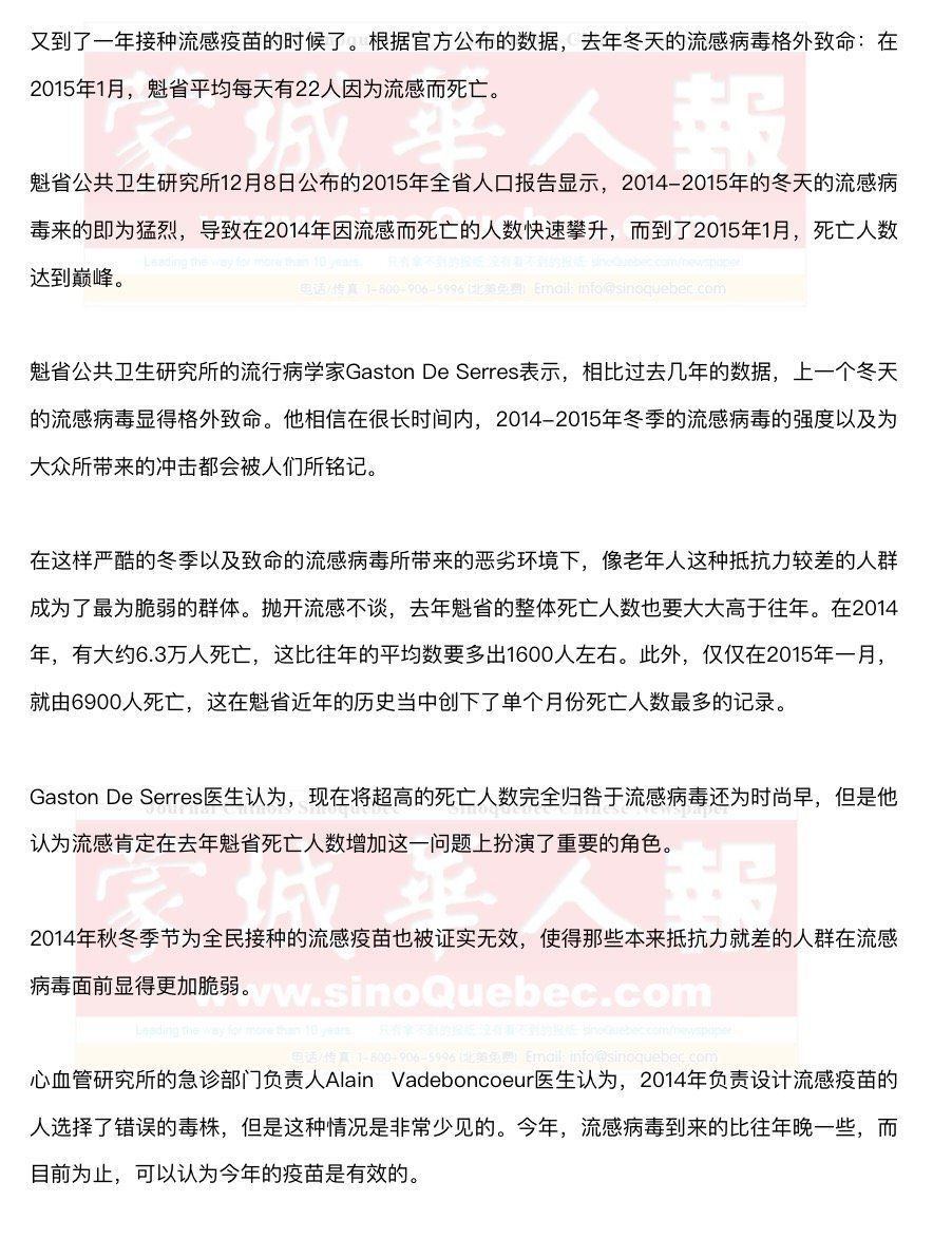 魁省2015-2016冬季流感的疫苗接种工作从11月1日开始。魁北克的流感免疫接种项目为民众提供将近200万剂的疫苗。年龄在6到23个月的婴儿,2岁到17岁且患有慢性疾病的儿童和青少年,在妊娠2期和3期的怀孕女性,患有慢性疾病的成年人,以及年龄在60岁以上的老人,都是免费接种疫苗的。另外,上述不同人群的家人,年龄在6个月以下的婴儿的家人以及医疗工作者,其疫苗接种费用同样也是由这个公共项目来支付的。 |