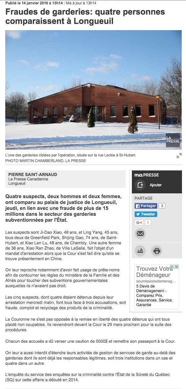 今天,魁省四名涉嫌诈骗补助日托计划的嫌疑人在蒙特利尔南岸Longueuil市法庭出庭,据法语媒体La Presse报道,四名嫌犯均为华人。 昨天1月13日,魁北克警方在蒙特利尔南岸Chambly市,Greenfield Park市和Saint-Hubert市逮捕了四名嫌疑人,他们涉嫌作假获得政府对日托补贴,涉案总紧额达1500万元,均将面临刑事指控。 据报道,涉案人员共5人,他们违反同一个家庭不能拥有超过5个私人补贴日托中心或超过300个位置的法律,均将面临欺诈、共谋以及洗钱的指控。 5名嫌疑人分别是: