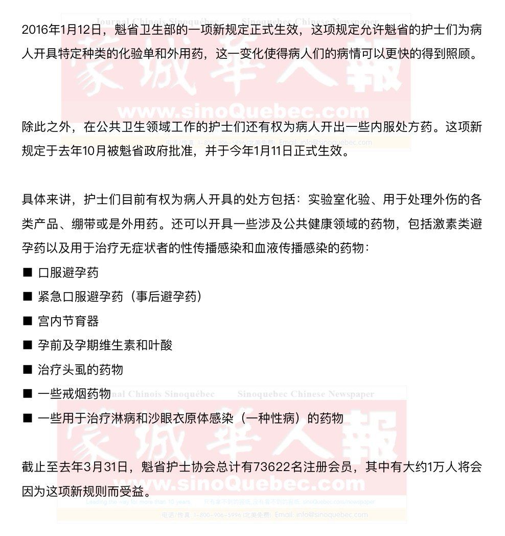 魁省的护士们多年来一直在要求增加他们的职责和工作内容,但是这一提议一直遭到医生们的强烈反对。魁省护士协会主席Lucie Tremblay认为这个新规定对于广大群众来说是一个重大利好消息。对于护士们来说,这一专业人群在工作时获得了更多的自主权。她还认为,此前魁省众多的护士们的工作能力和专业知识并没有被完全发挥。为了得到开具药方的权利,护士们必须具有医学护理学士学位或是完成了所需的全部培训课程。 在护士们之前,魁省的药剂师们已经在去年得到了开具一些特定的处方药的权利。这些处方药主要被用来治疗一些相对较轻的健康问题,包括口腔溃疡、湿疹、痛经、轻微的粉刺、痔疮、尿布疹、过敏性结膜炎、口唇疱疹、女性尿道感染、过敏性鼻炎、真菌性阴道炎以及复发性鹅口疮等。 药剂师们虽然可以开具处方,但却不具备诊断的权利。也就是说,患有以上疾病的病人必须曾经接受过医生的诊断,并且该医生也开出了相关药物的处方,该病人才能在避免为同样的病情再次就诊的前提下直接到药店买药。 |