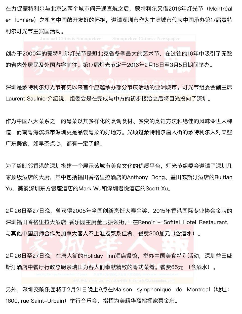 接到灯光节请柬的美国波士顿将以嘉宾城市的身份参与节日庆典。波士顿市将派出七位大厨,用陆地和海洋出产的各种食材征服广大饕客的味蕾。在这七位大厨中,有声名在外的Barbara Lynch。 与蒙特利尔一河相隔的Laval市将负责为灯光节提供魁北克特色餐。虽然Laval市美食一直不入蒙特利尔本地人的法眼,但灯光节组委会认为它总还是能够给远道而来的客人一个惊喜。 另外值得一提的是,2016年蒙特利尔灯光节的最后一周恰好与学校春假重叠,陪家长一起“看热闹”的孩子能够在参加灯光节活动的餐厅以儿童价格(依孩子的年龄而定)享受到大份的成人餐。想让孩子快乐地品尝各地美食的家长一定不要错过这个良机。 如需了解更多活动资讯,请访问蒙特利尔灯光节官方网站:montrealenlumiere.com。 |