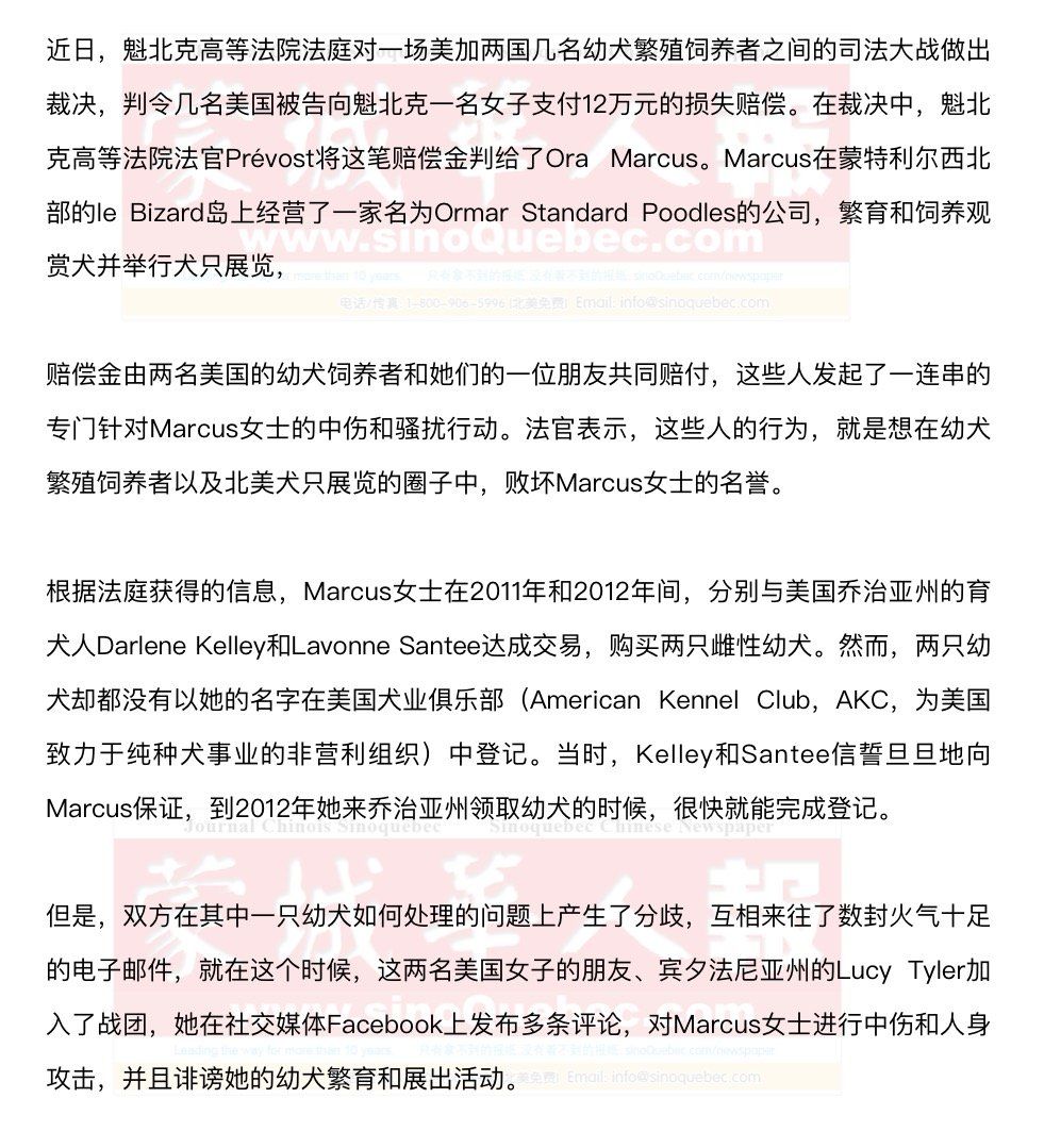 法官Prévost表示,从最低限度来讲,她们的行为是对Marcus女士的中伤,是有辱人格的和无礼的。在社交媒体上,被告发布了大量的带有污蔑性质和不实的评论,指控Marcus女士培育患病幼犬,而且还用染色剂给狗鼻子染色,冒充纯种犬。 法官Prévost指出,Santee在Facebook上发布了带有诽谤性质的讯息,其中有一条暗指Marcus是一架“幼犬绞肉机”。Santee发布的这些消息传播给了数千人,并且波及到了蒙特利尔。法官称,被告Kelley甚至还试图在蒙特利尔英文报纸《Gazette》上发布广告,称有一只狗丢失,它最后一次被人发现,是被Ile Bizard岛上的O. Marcus占有。不过,《Gazette》拒绝登载这条广告。 2012年,Marcus在魁北克高等法院提起了诉讼。她向法庭主张说,由于购买幼犬的合同是在魁北克签订的,而且对方给她的伤害也是在这里造成的,因此本案理应归属本地司法裁判权裁处。法官Prévost对此表示赞同。 在这起案件的审理中,被告没有出庭作证。法官判令3名被告向Marcus女士支付40,000元的精神损失赔偿,5,000元的惩罚性赔偿,6,000元的延误注册赔偿,以及判令被告Kelley一人承担Marcus女士71,023元的司法费用,同时,所有3名被告必须结束和终止,在Facebook上或在口头上的,以电子文档形式或任何其他方式,再提及Marcus女士的名字。 |