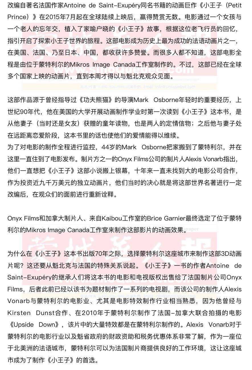 在拍摄制作方面,为体现书中讲述的故事里小王子的世界与小女孩真实成人世界的反差,导演尝试了不同的技巧和动画展示方式来体现不同的精神状态,小女孩和她的世界——母亲、房子、飞行员、飞行员家的花园——采用以冷色调为主的CG动画技术呈现;相反,原著中的小王子与整个世界通过定格拍摄手绘纸模设计的角色形象方式描述,同时运用了大量暖光和阴影。 除了《小王子》之外,Onyx Films和Mikros Image Canada还联合制作了另外一部儿童动画影片《明月守护者》(Mune),这部影片讲述的是一座星球因为太阳和月亮被偷走而陷入黑暗的故事。得益于《小王子》和《明月守护者》的成功,Mikros Image Canada一跃成为魁省规模最大的两家电影和动画特效工作室之一。 Mikros在2011年落户蒙特利尔,当时还默默无闻的这座小工作室的野心是在3年内发展成为拥有50名雇员的大型工作室。但是对于这家工作室来说,现实显然要比梦想还要美好:在完成了第一份工作(一部关于阿尔及利亚的电影)之后,Mikros Image Canada成功的获得了为电影《高卢英雄拯救英格兰》(Astérix et Obélix : au service de Sa Majesté)制作特效的工作。紧接着到来的就是2013年2月的《明月守护者》以及7月的《小王子》。Mikros公司蒙特利尔工作室的总经理Pascal Laurent表示,这2部作品直接让Mikros Image Canada的规模扩大了数倍,揽入了大量有才华的艺术家。Mikros公司除了在蒙特利尔设有工作室以外,还在法国、比利时和卢森堡等欧洲国家拥有5家工作室,2014年,雇员人数达到200人。 公司的CG(动画)制作人Olivier Rakoto表示,工作室尤其从海外招聘了不少魁北克艺术家,他们认为,为了参与这两部大作的制作是值得回到魁省工作和居住的。 随着大量人才的加入,Mikros公司的高管们的野心也越来越大。该公司现在计划在几年内将其位于蒙特利尔老城的Mikros Image Canada发展成为好莱坞以外最大的动画工作室。好莱坞由于拥有皮克斯(Pixar)这样的大型工作室的存在,使得它在动画制作领域的龙头地位很难被撼动。Olivier Rakoto表示,Mikros Image Canada希望成为一家高档的独立动画工作室。除了制作动画片以外,Mikros Image Canada工作室还承接大量的电影特效工作。 |