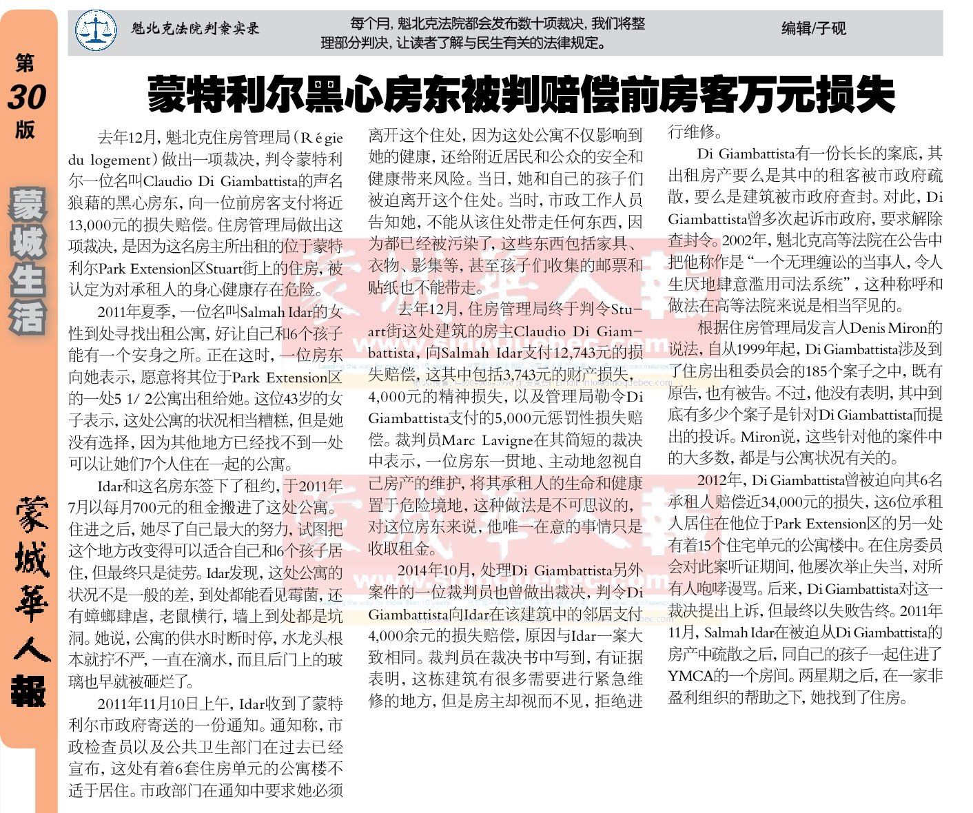 去年12月,魁北克住房管理局(Régie du logement)做出一项裁决,判令蒙特利尔一位名叫Claudio Di Giambattista(上图)的声名狼藉的黑心房东,向一位前房客支付将近13,000元的损失赔偿。住房管理局做出这项裁决,是因为这名房主所出租的位于蒙特利尔Park Extension区Stuart街上的住房,被认定为对承租人的身心健康存在危险。 |