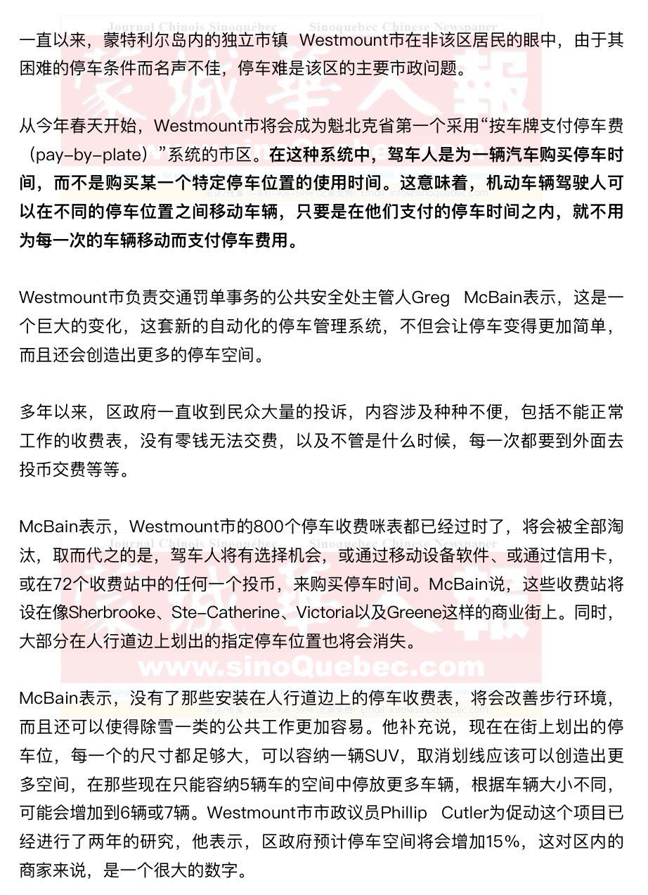Westmount市新的停车管理方式,与蒙特利尔几年前就已经实施的一种方式相类似,除了当驾车人购买停车时间交费的时候,被要求输入他们的汽车注册车牌号码而不是停车位编号之外。这一套系统已经在卡尔加里和卑诗省的惠斯勒以及美国包括波士顿和匹兹堡在内的几个城市中得到应用。 虽然Westmount市的新停车系统即将实施,但是不要以为很快就能看到按车牌支付停车费的系统不久之后就会出现在蒙特利尔的街头。 预计实行这种新停车收费系统后,Westmount停车费率不会上涨。Westmount有两块停车区域:Greene街以东,停车费为每小时3元,与蒙特利尔市中心相同;其他地方停车位的收费为每小时2元。目前,仅在其中一个区域以每小时接近2元的费率推行新收费系统的计划,正在讨论之中。 在使用新的收费系统之后,公共安全官员将通过手提式的自动车牌识别设备来探查违规行为,这种设备装配有特殊的摄像头,可以对停在街头的每一辆汽车的牌照进行识别。McBain表示,在这种设备读取每一辆车的牌照之后,将会反馈该车是否支付停车费用,如果显示未支付,它将会打印出罚单。 一直以来,Montreal市和Westmount市的许多商家,对停车位数量不足以及拖延日久的道路施工工程满腹怨言,称这使得他们的生意受到影响,造成生意额下降。不过,Cutler相信,实行新系统之后,停车位置的增多以及车辆在街道上移动的能力的提高,将会吸引更多的购物者来到这个地区消费。 |