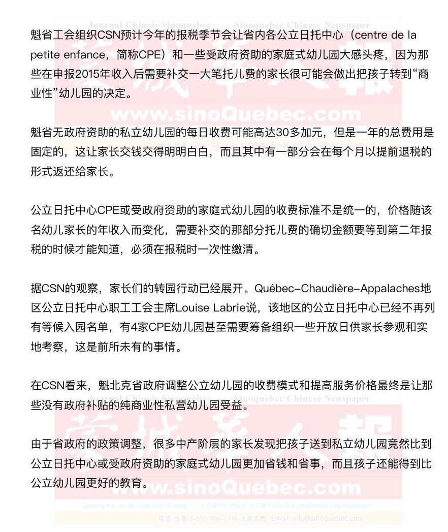 3月14日,在1994年担任教育厅厅长时一手创立了魁省“五元一天”低价公立日托服务的魁省前省长、魁人党前党魁Pauline Marois出现在魁省工会CSN当天推出的广告中,呼吁魁省自由党不要在本周公布的新年度预算案中削减教育经费。 |