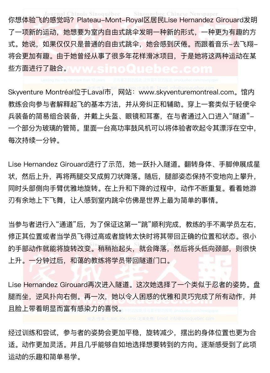 去年,Hernandez Girouard首次为加拿大室内跳伞锦标赛编排了一套舞蹈动作。通过技术团队的努力,令围坐在名为“隧道”的大圆筒外面的观众们,在观看隧道内表演的同时,也能够听到音乐。 为此她在隧道圆筒中练习了50个小时和超过600次跳跃,她还希望继续发展和教授这个新的项目。她说,对于她来说,这是发挥自己爱好的一个难以置信的机会。可以精心锤炼自己的技术并且教授给他人。 年过四十的Hernandez Girouard女士,看上去仅仅25岁的样子。今年夏天她还被法国里尔一家新的室内跳伞运动中心聘用,这个中心将于明年1月份开幕。到目前为止,她这个未来艺术舞蹈的视频,在YouTube上已经被浏览了4万次,她的Facebook页面也拥有了超过300名订阅者。 |