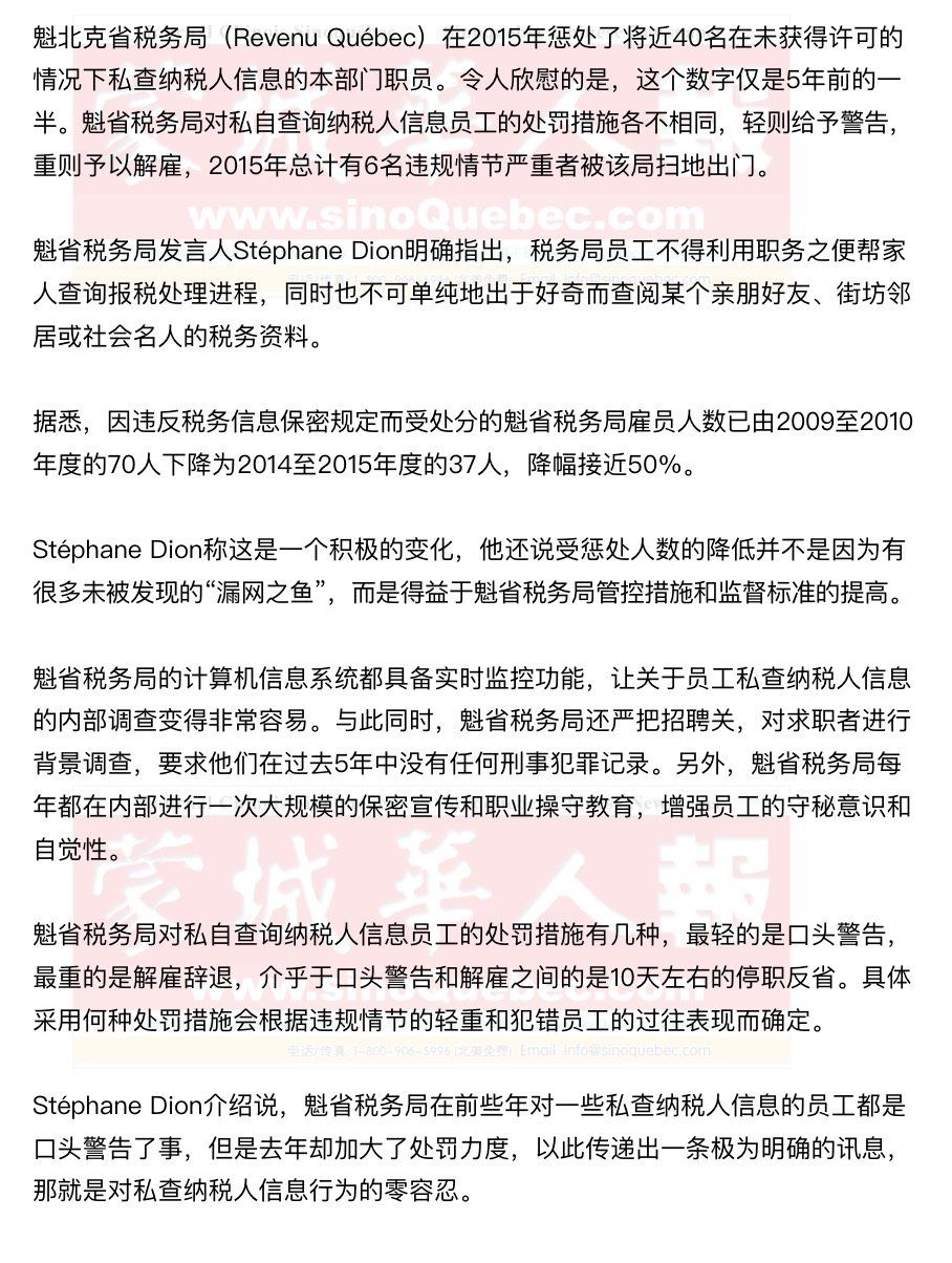 代表4500名魁省税务局雇员利益的工会组织Syndicat des professionnels du gouvernement du Québec(魁北克省政府专业人士联合会,简称SPGQ)对魁省税务局的处罚措施表示赞同。SPGQ主席Richard Perron称他们已劝说工会成员遵守雇主严格但却合理的管理规定,避免纳税人税务资料外泄。 SPGQ正在处理一些政府雇员提出的违纪申诉,但Richard Perron主席因遵循保密原则而不愿透露其中的细节,所以现在还无从知晓是否有魁省税务局雇员因违反纳税人信息保密规定受处分而提起申诉。Richard Perron主席强调,尽全力保护会员们的权益是SPGQ的职责,但这要以尊重事实为前提,而不是黑白不分地盲目偏袒。 意在避免雇员无授权私查纳税人信息的内部调查通常由魁省税务局组织专人进行,而不是由雇员的上级主管负责。 |