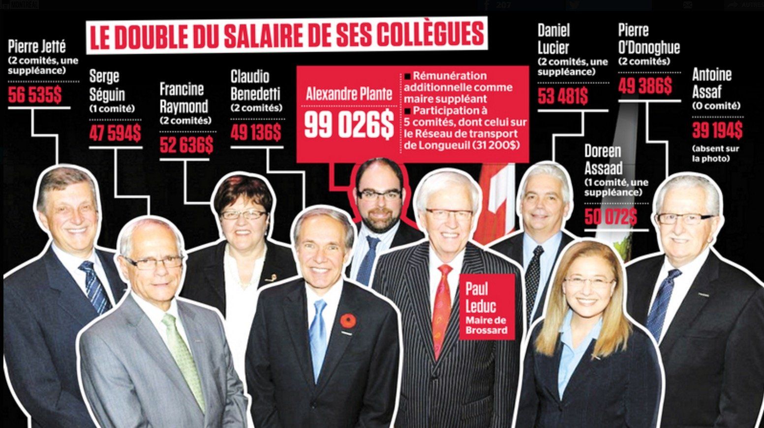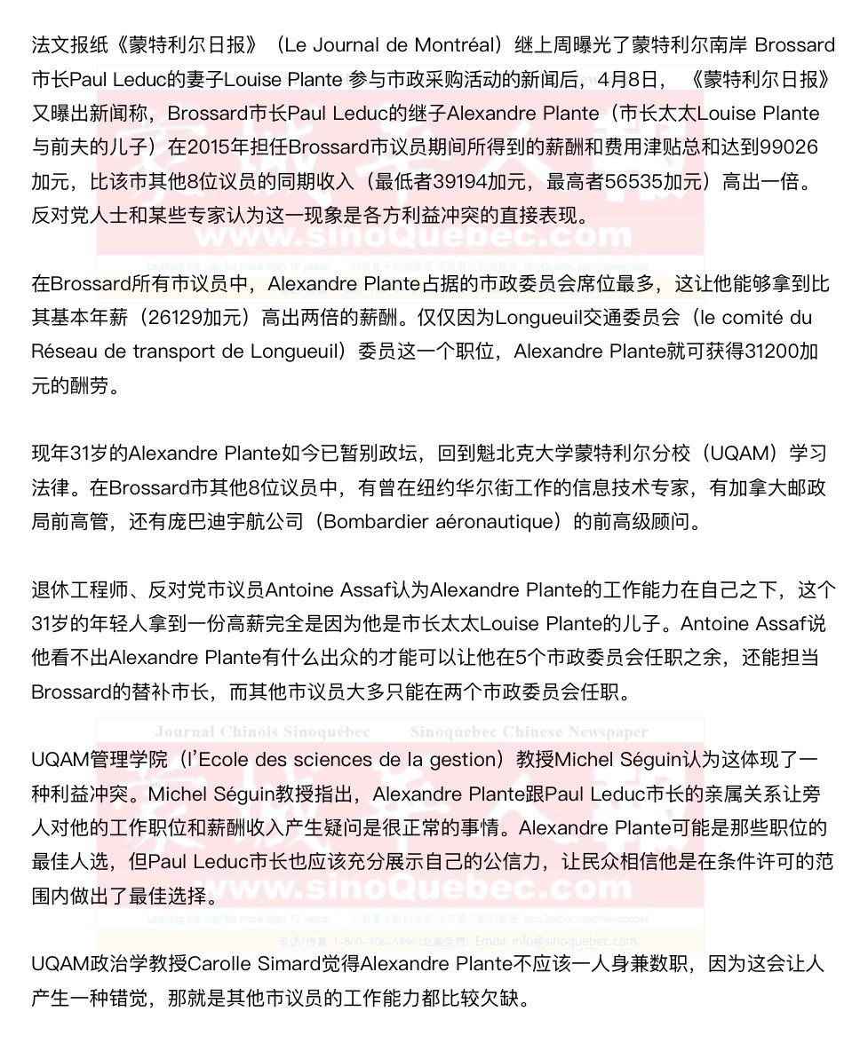 而Alexandre Plante辩称他的工作职务安排都是同事们在党团会议上商讨后一致决定并获市议会通过的,但他拒绝透露Paul Leduc市长是否在最开始的时候对其提名做出过举荐。其他Brossard市议员均拒绝接受媒体采访。 Alexandre Plante承认所有人都知道他跟Paul Leduc市长的亲属关系,但不认为这里面有什么“利益冲突”。 正在度假的Paul Leduc市长在接受媒体采访后指出,Alexandre Plante是蒙特利尔大都会社区委员会(le comité de la Communauté métropolitaine de Montréal)和Longueuil交通委员会的最佳人选,因为这两个委员会的工作是“相通”的,而Alexandre Plante对公共交通非常感兴趣,同时还在蒙特利尔大学(l’Université de Montréal)学习过城市规划。 |