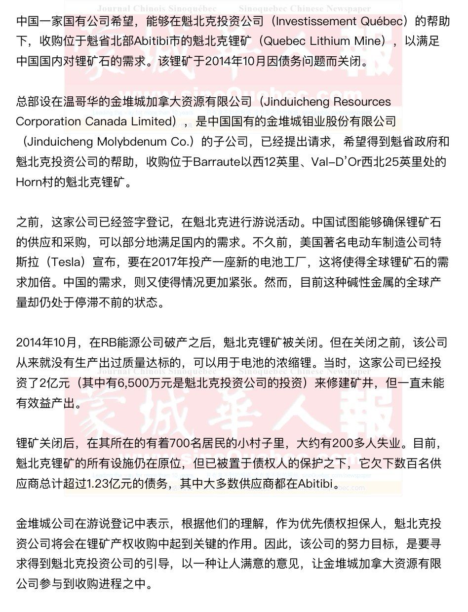 希望收购魁北克锂矿的这家中国公司另有一个下属子公司,在育空特区收购了一个多金属矿(含银和金的锌精矿、铜精矿以及铅精矿)。据该公司所说,这是位于北美的第一个属于中国国有公司的、由中国国有公司运作、经营和开发的矿藏。但是,在2015年1月,这个多金属矿被关闭。卑诗省高等法院的文件指出,这座多金属矿有6亿多元的债务,其中包括欠下育空52家公司企业的430万元。 对魁北克锂矿感兴趣的不只中国金堆城公司。去年12月份,魁北克资源公司Glen Eagle Resources也表达了希望收购魁北克锂矿的意愿。这家公司在Abitibi的La Motte已经有了一处矿业,其中包括锂矿,如能收购成功,两处锂矿将会合并。 锂是一种稀有金属,广泛用于电子工业和电动汽车。在世界范围内,美国和中国一直在为争夺这种稀有金属角力。如果特斯拉公司投产的全球最大的电池工厂能够在2017年开始生产,届时将会使全球的锂需求量加倍。从2015年末至今,碳酸锂的价格已经从每吨6,000元,增长到了每吨13,000多元。 |