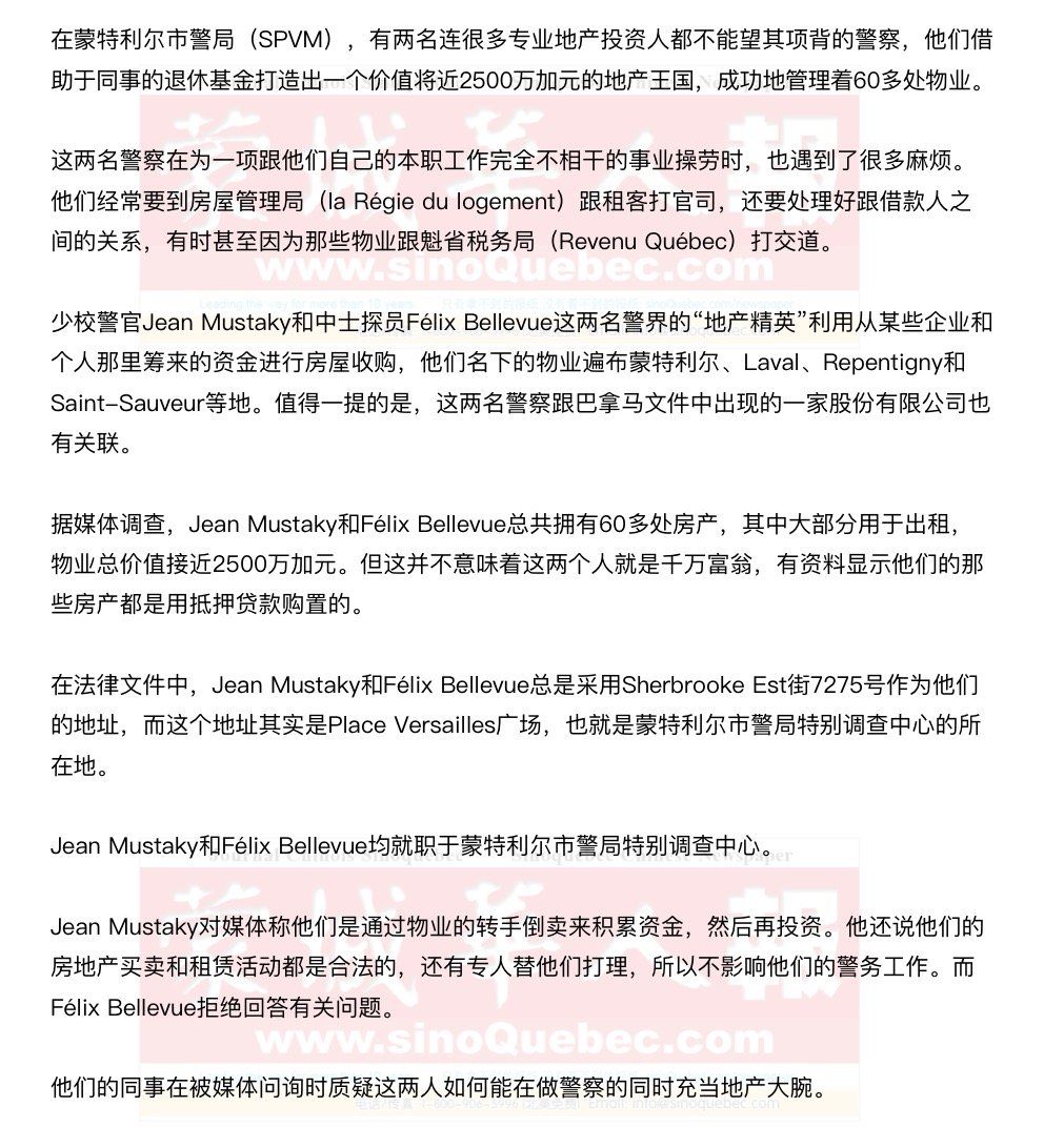 据悉,为了扩张他们的地产王国,Jean Mustaky和Félix Bellevue曾四处借贷,连警察的退休基金都成了他们的筹资对象。根据媒体查询到的贷款资料,Jean Mustaky和Félix Bellevue曾向蒙特利尔警察退休与慈善事业联合会(l’Association de bienfaisance et de retraite des policiers de Montréal)借得500多万加元,但现在只有170万加元的抵押还依然有效。 联合会副主席Joel Savard称借贷双方是严格遵照内部投资规则行事,实际借贷金额并不会跟魁省地产登记局(registre foncier du Québec)的文件完全吻合。 蒙特利尔市警局发言人Ian Lafrenière说局里已经知道了这件事,并且已经就此展开核查。但他以避免影响调查工作为由,拒绝透露更多信息。 |