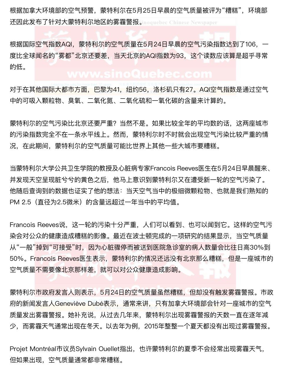反气旋现象 根据加拿大环境部的气象学家Marie-Eve Giguère,造成本周蒙特利尔空气质量极为糟糕的罪魁祸首是上周末期间出现在魁省南部的一个反气旋系统。她说,这之前蒙特利尔地区的天气非常好,天空晴朗、气压相对较高,也几乎没有风。通常来讲空气污染会在早晨最为严重,因为土壤会在夜间降温,使得地标附近的大气移动速度下降。在一天之间,大气逐渐升温,随之产生的风会将细微颗粒物吹走。在早晨,蒙特利尔岛的中部和东部地区的空气质量被蒙特利尔市政府的空气质量监视网络(RSQA)认定为“糟糕”。在傍晚,全岛范围内的空气质量转为“可接受”。在2015年,蒙特利尔有64天的空气质量被认定为“糟糕”,比2014年多出了一天。 污染源头 那么,在蒙特利尔地区观察到的这些可吸入颗粒物是从哪来的呢?蒙特利尔大学公共卫生学院的教授及心脏病专家Francois Reeves医生表示,小轿车、卡车和其他靠燃油驱动的车辆,以及在冬季依靠燃烧木头供暖的暖气系统都是这些污染物的主要源头。他还解释说,蒙特利尔的空气质量不佳并不全是本地污染造成的。实际上,蒙特利尔检测到的可吸入颗粒物当中,有30%来自于美国中西部,还有30%来自于安省。他指出,好消息是,最近几年来蒙特利尔空气污染严重的天数越来越少了,这主要得益于美国和安省关闭了大量靠烧煤供电的火力发电厂。要想让污染更进一步减少,蒙特利尔和魁省就需要在减少燃烧化石燃料(汽油和柴油),因为汽车污染已经成为蒙特利尔空气污染的最主要源头。Francois Reeves医生表示,在安省,一个叫做“清洁驾驶”(Drive Clean)的政府计划要求所有使用时间超过7年的车辆都要通过一项空气污染测试。虽然魁省看起来似乎没有能力颁布一条类似的法律,但是政府还是应该想想颁发,因为这对于改善空气质量有着很大帮助。不少安省居民都开始把自己家的“老爷车”卖给魁北克人,因为他们的车造成的空气污染太严重,政府已经不再给他们颁发牌照了。 |