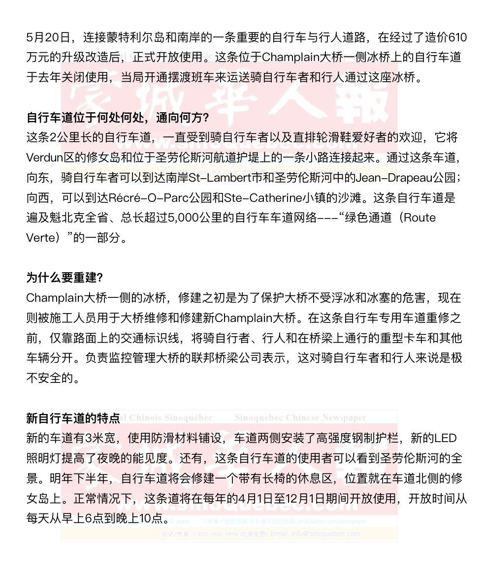 预计多少人会使用? 以前旧自行车道的使用量一直没有准确的数字。去年,在自行车道关闭期间,有两辆12座的摆渡班车从早上6点到晚上10点,在修女岛和堤坝之间来回运送骑自行车者和行人。在长周末,这项服务的工作量会加倍以适应更高的交通流量。官员们表示,预计新车道每年的使用量将会多达20万人次,大约是Jacques Cartier大桥上的自行车道使用人次数的一半。 |