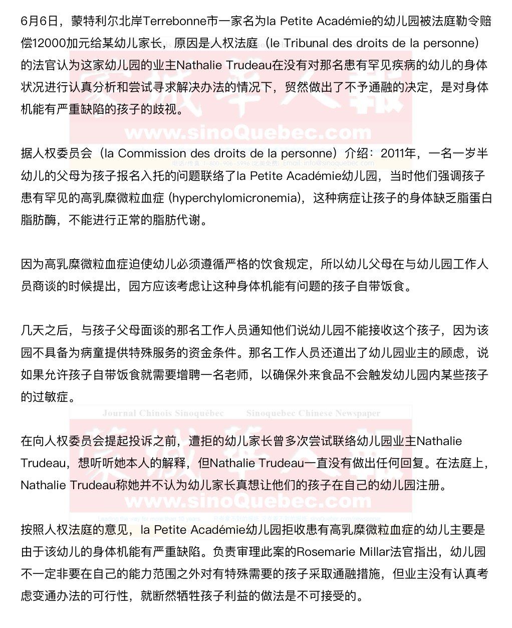 人权法庭最后判定la Petite Académie幼儿园歧视罪名成立,须向幼儿家长支付9000加元的精神损失费和3000加元的惩罚性赔偿款。 除了负责解决纠纷之外,人权委员会还可向企业主及单位管理人员提供咨询和建议,帮助他们正确面对雇员提出的通融请求。在人权委员会2015至2016年度处理的通融请求纠纷中,大约有64%都与当事人的身体或心理机能残障有关。 |