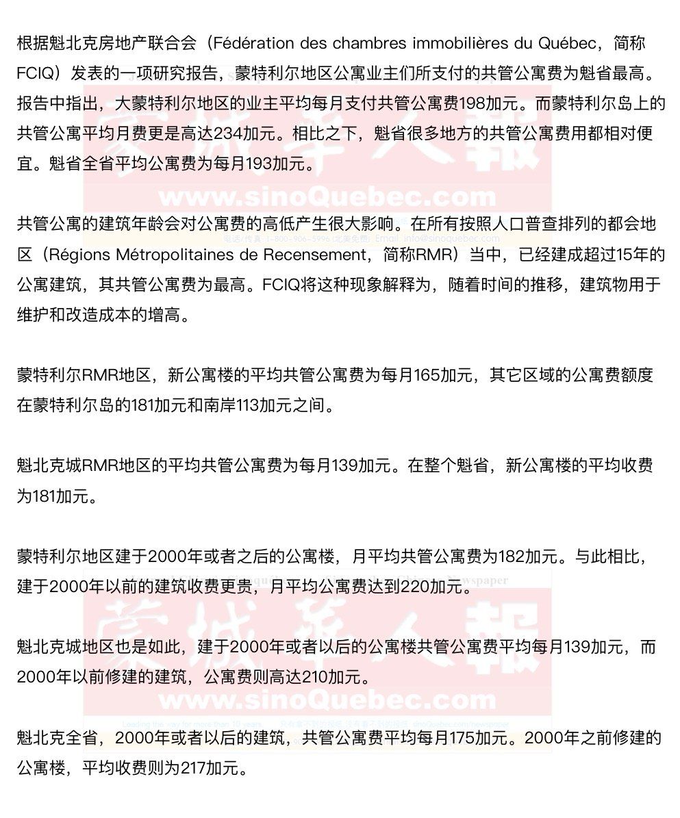 公寓楼的建筑结构也会影响公寓费的收费标准。水泥建筑的收费标准普遍高于木结构建筑。蒙特利尔地区,水泥建筑的月平均共管公寓费高达287加元,而木结构公寓楼的平均月份则仅为134加元。魁北克城地区,水泥公寓楼平均公寓费为每月235加元,木结构公寓楼月费为133加元。魁北克全省,水泥建筑公寓楼平均收费为每月281加元,木结构公寓楼的平均共管公寓费为每月136加元。