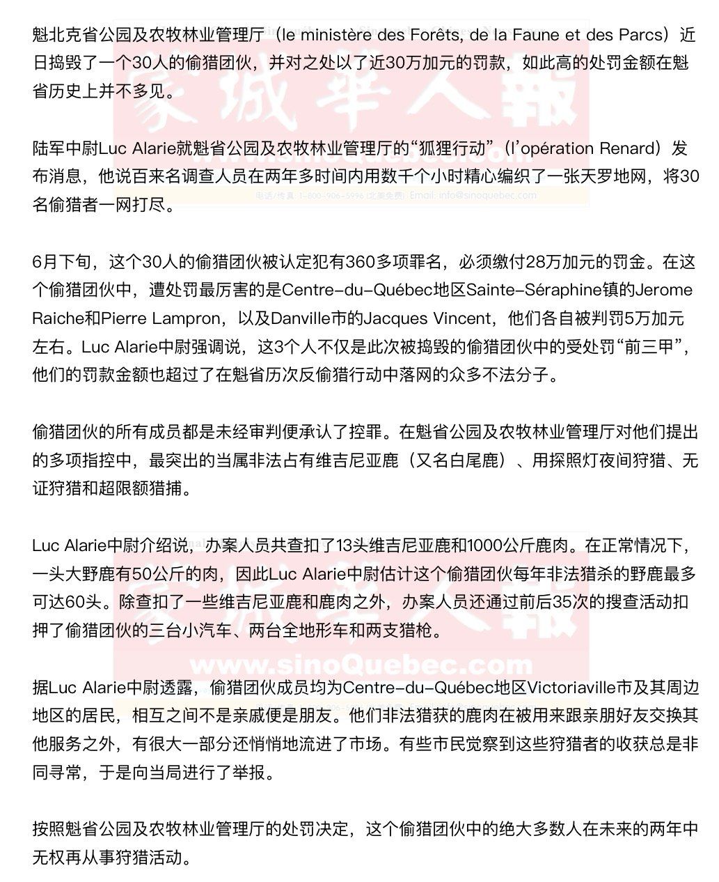 魁北克省渔猎联合会(la Fédération québécoise des chasseurs et pêcheurs)Centre-du-Québec分会主席Yvon Courchesne对当局的这一决定深表赞成。他说两年的禁猎时间对于一个狩猎爱好者来说很是漫长,禁猎令加上几千甚至几万加元的罚款,这是对不法猎手相当严厉的一种惩罚。 尽管如此,Yvon Courchesne主席仍慨叹偷猎是猎手中“太过常见”的行为,而这也就是为什么渔猎联合会一贯坚持对会员宣讲相关案例并谴责不法之徒。Yvon Courchesne还强调,魁省野鹿的数量在最近这些年中一直在不断减少,近日捣毁的那个偷猎团伙每年非法猎杀将近60头野鹿的行为明显地损害了其他守法猎人的利益。 |